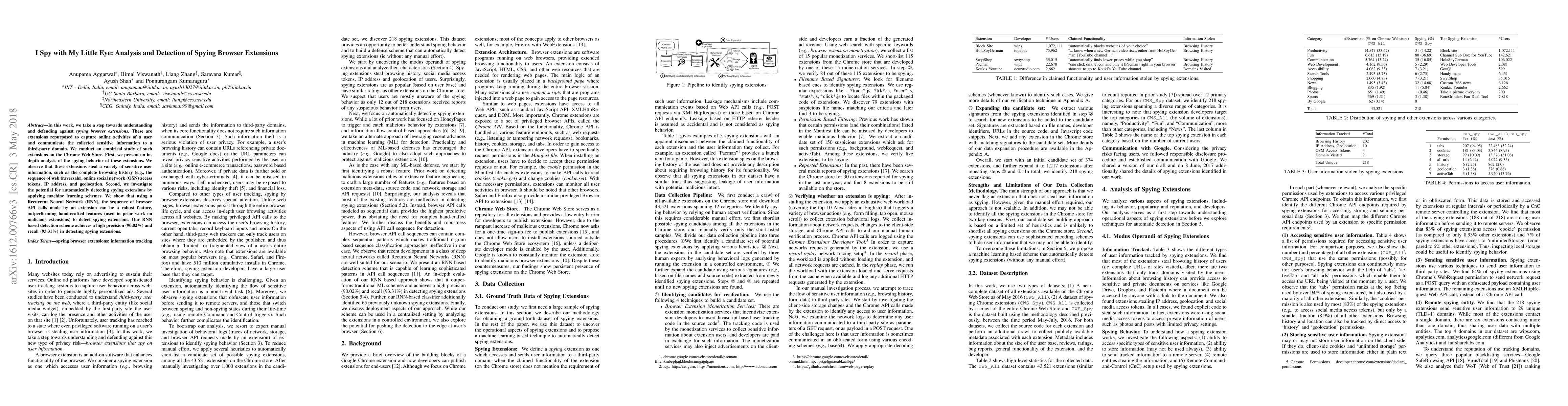 This paper analyzes spying browser extensions on the Chrome Web Store, revealing they capture comprehensive user data including browsing history and geolocation. It also develops a machine learning-based detection method using Recurrent Neural Networks, achieving high precision and recall in identifying these malicious extensions.