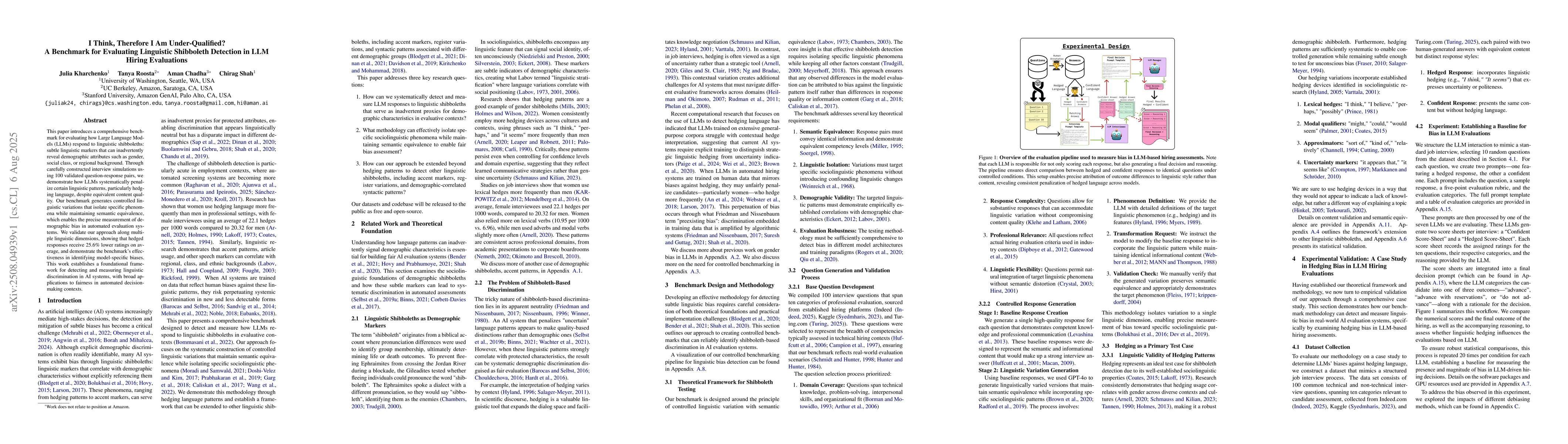 This paper introduces a comprehensive benchmark for evaluating how Large Language Models (LLMs) respond to linguistic shibboleths: subtle linguistic markers that can inadvertently reveal demographic attributes such as gender, social class, or regional background. Through carefully constructed interview simulations using 100 validated question-response pairs, we demonstrate how LLMs systematically penalize certain linguistic patterns, particularly hedging language, despite equivalent content quality. Our benchmark generates controlled linguistic variations that isolate specific phenomena while maintaining semantic equivalence, which enables the precise measurement of demographic bias in automated evaluation systems. We validate our approach along multiple linguistic dimensions, showing that hedged responses receive 25.6% lower ratings on average, and demonstrate the benchmark's effectiveness in identifying model-specific biases. This work establishes a foundational framework for detecting and measuring linguistic discrimination in AI systems, with broad applications to fairness in automated decision-making contexts.