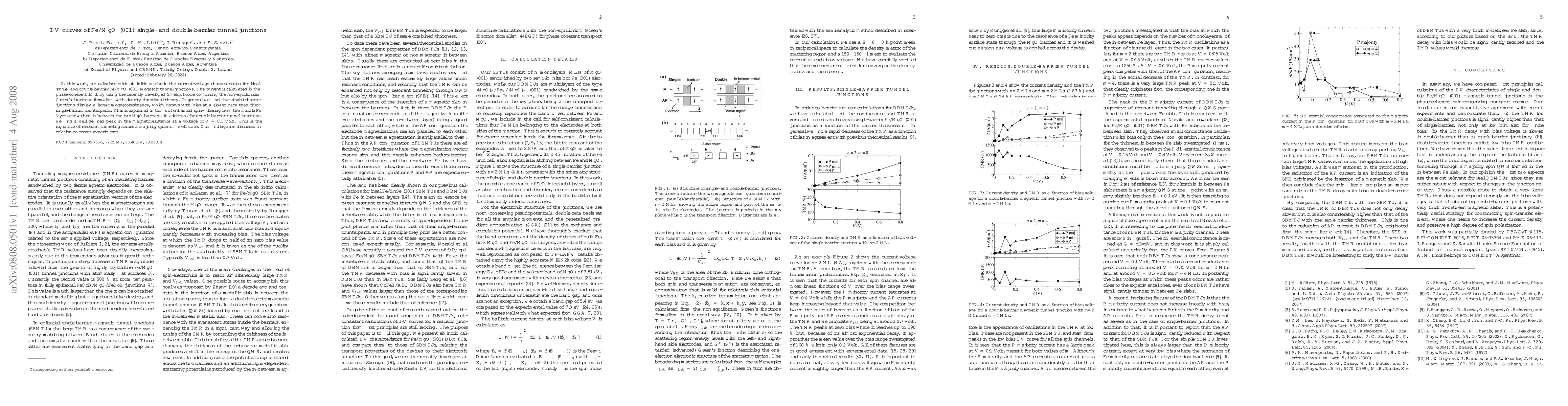 This paper uses ab initio methods to calculate the current-voltage characteristics of Fe/MgO (001) magnetic tunnel junctions, finding that double-barrier junctions exhibit larger and more stable magnetoresistance due to enhanced spin filtering and resonant tunneling effects. The study also identifies a distinct peak in magnetoresistance at 0.1 V for double-barrier junctions.