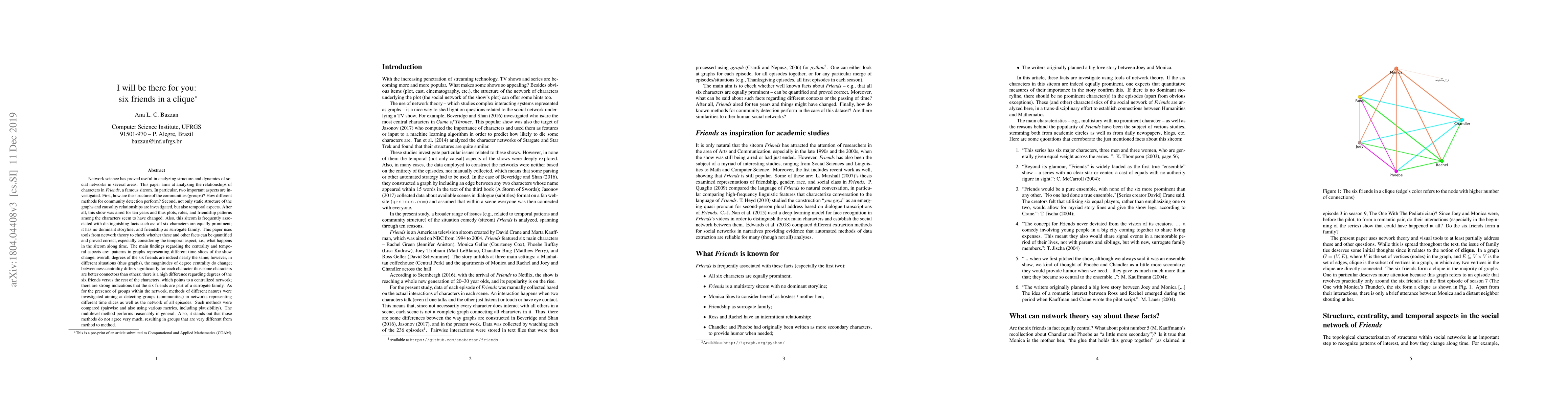 Network science has proved useful in analyzing structure and dynamics of social networks in several areas. This paper aims at analyzing the relationships of characters in the sitcom Friends. In particular, two important aspects are investigated. First, how are the structure of the communities. Second, not only static structure of the graphs and causality relationships are investigated, but also temporal aspects. Also, this sitcom is frequently associated with distinguishing facts such as: all six characters are equally prominent; it has no dominant storyline; and friendship as surrogate family. This paper uses tools from network theory to check whether these and other assumptions can be quantified and proved correct. The main findings regarding the centrality and temporal aspects are: patterns in graphs representing different time slices of the show change; overall, degrees of the six friends are indeed nearly the same; however, in different situations (thus graphs), the magnitudes of degree centrality do change; betweenness centrality differs significantly for each character thus some characters are better connectors than others; there is a high difference regarding degrees of the six friends versus the rest of the characters, which points to a centralized network; there are strong indications that the six friends are part of a surrogate family. As for the presence of groups within the network, methods of different natures were investigated aiming at detecting groups (communities) in networks representing different time slices as well as the network of all episodes. Such methods were compared (pairwise and also using various metrics, including plausibility). The multilevel method performs reasonably in general. Also, it stands out that those methods do not agree very much, resulting in groups that are very different from method to method.