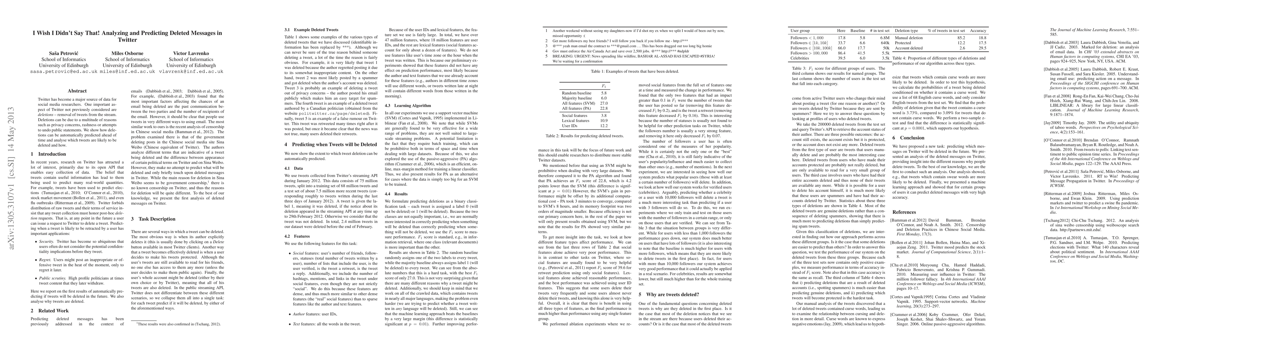 This paper explores the phenomenon of tweet deletions on Twitter, analyzing reasons behind them and developing a predictive model to foresee which tweets are likely to be deleted. The study aims to understand the implications of deletions in the context of social media communication.