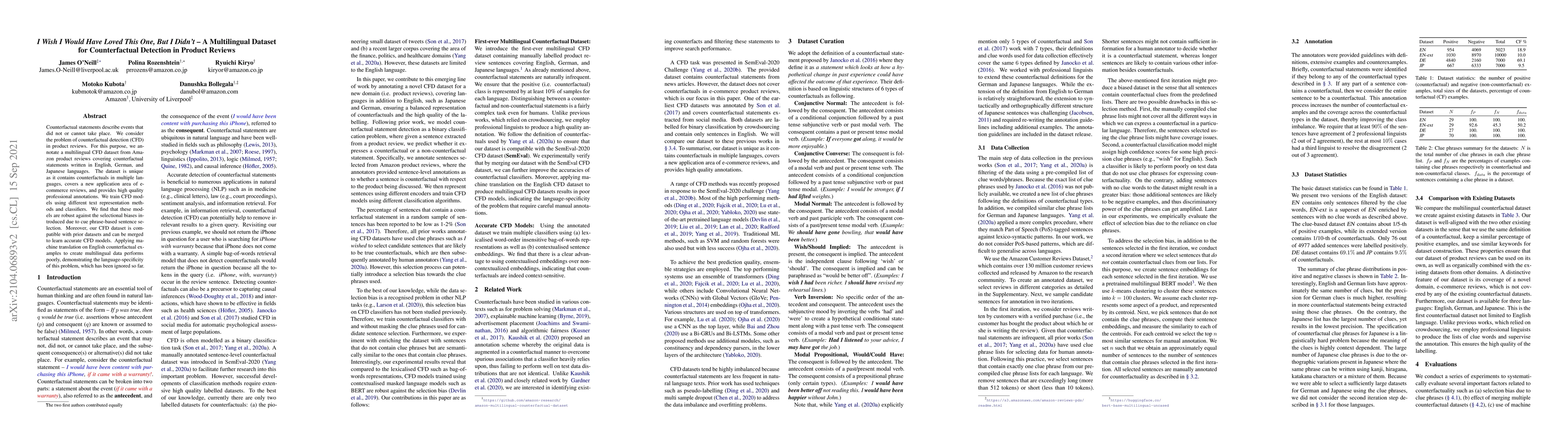 Counterfactual statements describe events that did not or cannot take place. We consider the problem of counterfactual detection (CFD) in product reviews. For this purpose, we annotate a multilingual CFD dataset from Amazon product reviews covering counterfactual statements written in English, German, and Japanese languages. The dataset is unique as it contains counterfactuals in multiple languages, covers a new application area of e-commerce reviews, and provides high quality professional annotations. We train CFD models using different text representation methods and classifiers. We find that these models are robust against the selectional biases introduced due to cue phrase-based sentence selection. Moreover, our CFD dataset is compatible with prior datasets and can be merged to learn accurate CFD models. Applying machine translation on English counterfactual examples to create multilingual data performs poorly, demonstrating the language-specificity of this problem, which has been ignored so far.