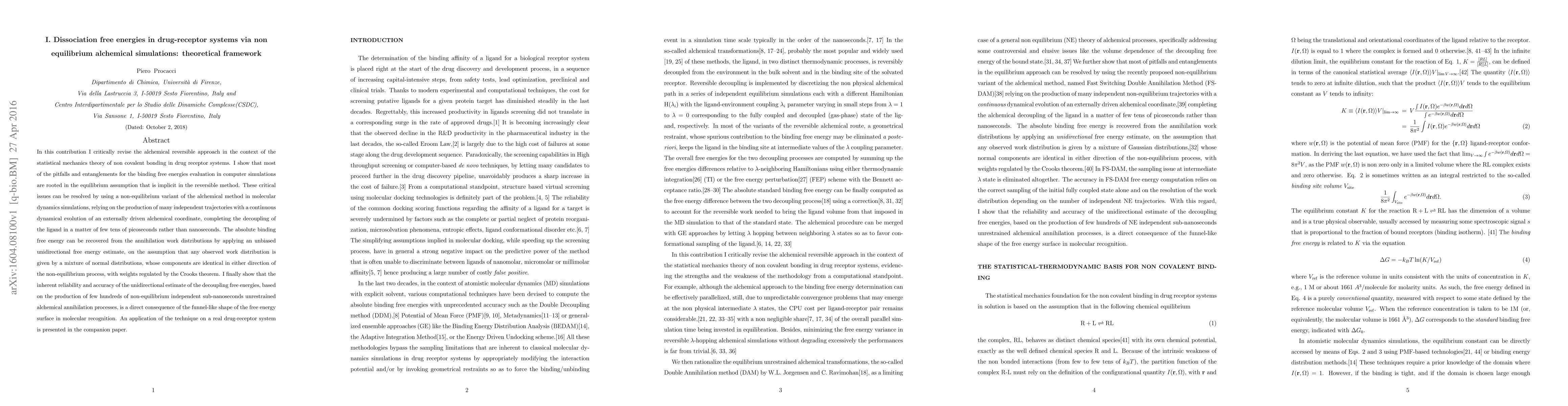 In this contribution I critically revise the alchemical reversible approach in the context of the statistical mechanics theory of non covalent bonding in drug receptor systems. I show that most of the pitfalls and entanglements for the binding free energies evaluation in computer simulations are rooted in the equilibrium assumption that is implicit in the reversible method. These critical issues can be resolved by using a non-equilibrium variant of the alchemical method in molecular dynamics simulations, relying on the production of many independent trajectories with a continuous dynamical evolution of an externally driven alchemical coordinate, completing the decoupling of the ligand in a matter of few tens of picoseconds rather than nanoseconds. The absolute binding free energy can be recovered from the annihilation work distributions by applying an unbiased unidirectional free energy estimate, on the assumption that any observed work distribution is given by a mixture of normal distributions, whose components are identical in either direction of the non-equilibrium process, with weights regulated by the Crooks theorem. I finally show that the inherent reliability and accuracy of the unidirectional estimate of the decoupling free energies, based on the production of few hundreds of non-equilibrium independent sub-nanoseconds unrestrained alchemical annihilation processes, is a direct consequence of the funnel-like shape of the free energy surface in molecular recognition. An application of the technique on a real drug-receptor system is presented in the companion paper.