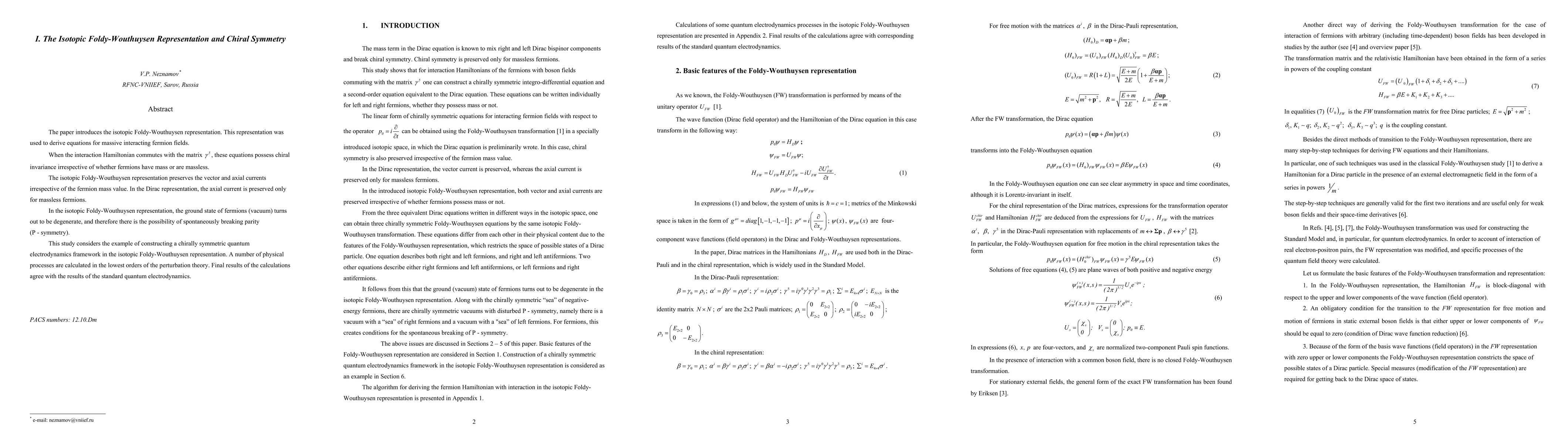 The paper presents the isotopic Foldy-Wouthuysen representation, demonstrating chiral invariance in massive and massless fermion interactions and preserving vector and axial currents. It constructs a chirally symmetric quantum electrodynamics framework and shows agreement with standard results.