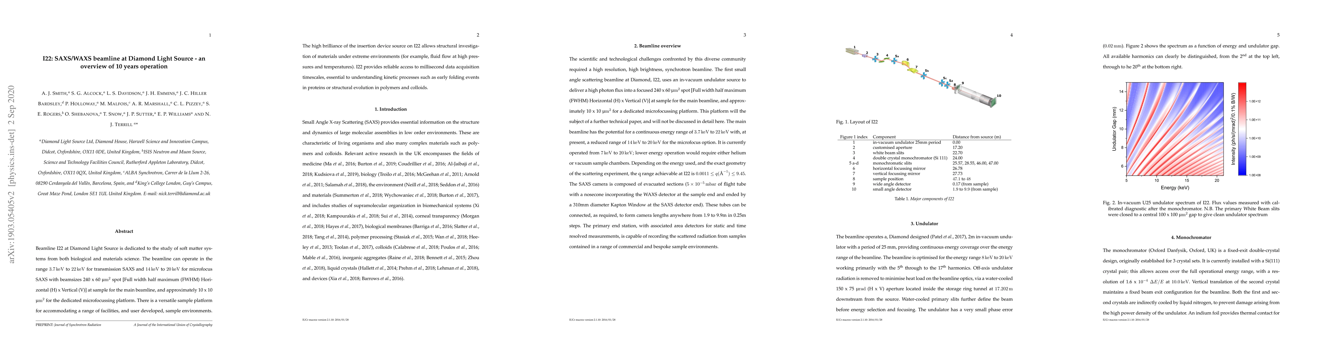 Beamline I22 at Diamond Light Source, dedicated to soft matter systems from biological and materials science, operates in a range of 3.7 keV to 22 keV for transmission SAXS and 14 keV to 20 keV for microfocus SAXS, with beam sizes of 240 x 60 µm² and approximately 10 x 10 µm², respectively. The beamline features a versatile sample platform and high brilliance insertion device source for structural investigations under extreme environments.