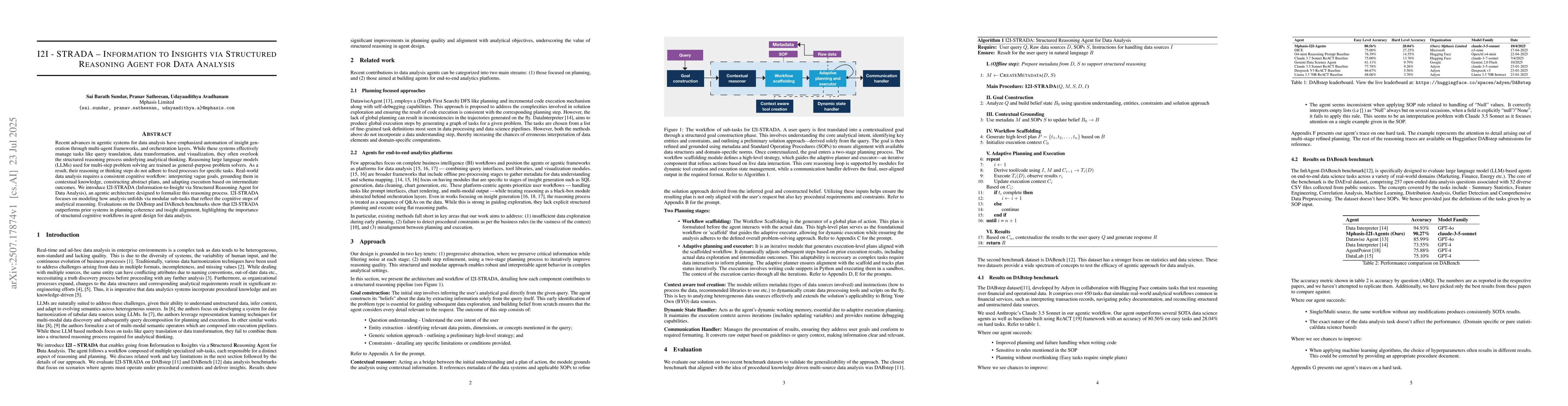 Recent advances in agentic systems for data analysis have emphasized automation of insight generation through multi-agent frameworks, and orchestration layers. While these systems effectively manage tasks like query translation, data transformation, and visualization, they often overlook the structured reasoning process underlying analytical thinking. Reasoning large language models (LLMs) used for multi-step problem solving are trained as general-purpose problem solvers. As a result, their reasoning or thinking steps do not adhere to fixed processes for specific tasks. Real-world data analysis requires a consistent cognitive workflow: interpreting vague goals, grounding them in contextual knowledge, constructing abstract plans, and adapting execution based on intermediate outcomes. We introduce I2I-STRADA (Information-to-Insight via Structured Reasoning Agent for Data Analysis), an agentic architecture designed to formalize this reasoning process. I2I-STRADA focuses on modeling how analysis unfolds via modular sub-tasks that reflect the cognitive steps of analytical reasoning. Evaluations on the DABstep and DABench benchmarks show that I2I-STRADA outperforms prior systems in planning coherence and insight alignment, highlighting the importance of structured cognitive workflows in agent design for data analysis.