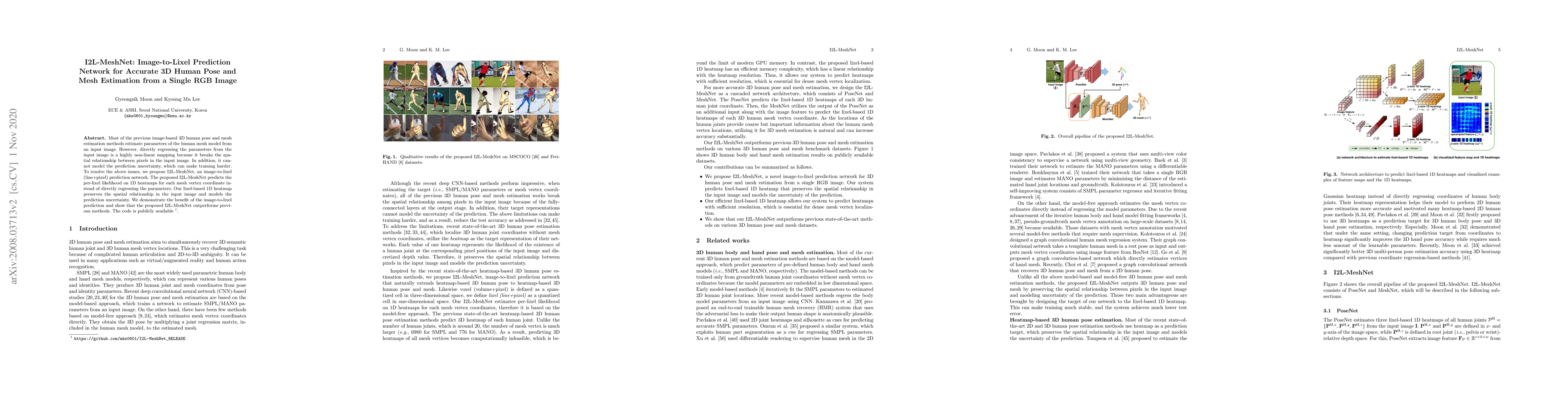 I2L-MeshNet proposes an image-to-lixel prediction network for accurate 3D human pose and mesh estimation from a single RGB image, addressing non-linear mapping and uncertainty modeling issues. The method predicts per-lixel likelihoods on 1D heatmaps, preserving spatial relationships and prediction uncertainty, outperforming previous methods.