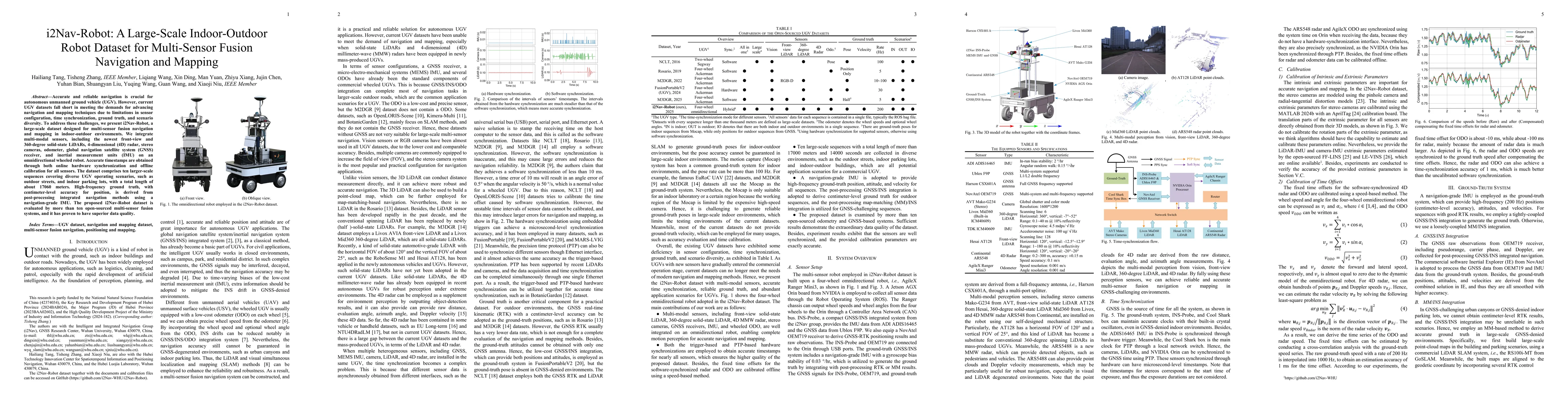 Accurate and reliable navigation is crucial for autonomous unmanned ground vehicle (UGV). However, current UGV datasets fall short in meeting the demands for advancing navigation and mapping techniques due to limitations in sensor configuration, time synchronization, ground truth, and scenario diversity. To address these challenges, we present i2Nav-Robot, a large-scale dataset designed for multi-sensor fusion navigation and mapping in indoor-outdoor environments. We integrate multi-modal sensors, including the newest front-view and 360-degree solid-state LiDARs, 4-dimensional (4D) radar, stereo cameras, odometer, global navigation satellite system (GNSS) receiver, and inertial measurement units (IMU) on an omnidirectional wheeled robot. Accurate timestamps are obtained through both online hardware synchronization and offline calibration for all sensors. The dataset comprises ten larger-scale sequences covering diverse UGV operating scenarios, such as outdoor streets, and indoor parking lots, with a total length of about 17060 meters. High-frequency ground truth, with centimeter-level accuracy for position, is derived from post-processing integrated navigation methods using a navigation-grade IMU. The proposed i2Nav-Robot dataset is evaluated by more than ten open-sourced multi-sensor fusion systems, and it has proven to have superior data quality.