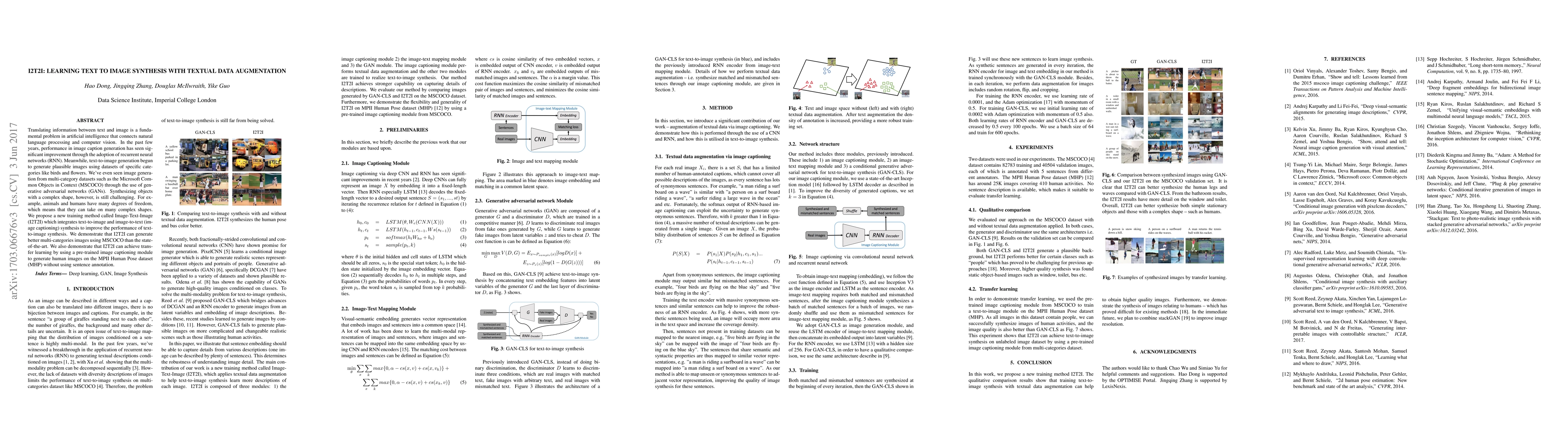 Translating information between text and image is a fundamental problem in artificial intelligence that connects natural language processing and computer vision. In the past few years, performance in image caption generation has seen significant improvement through the adoption of recurrent neural networks (RNN). Meanwhile, text-to-image generation begun to generate plausible images using datasets of specific categories like birds and flowers. We've even seen image generation from multi-category datasets such as the Microsoft Common Objects in Context (MSCOCO) through the use of generative adversarial networks (GANs). Synthesizing objects with a complex shape, however, is still challenging. For example, animals and humans have many degrees of freedom, which means that they can take on many complex shapes. We propose a new training method called Image-Text-Image (I2T2I) which integrates text-to-image and image-to-text (image captioning) synthesis to improve the performance of text-to-image synthesis. We demonstrate that %the capability of our method to understand the sentence descriptions, so as to I2T2I can generate better multi-categories images using MSCOCO than the state-of-the-art. We also demonstrate that I2T2I can achieve transfer learning by using a pre-trained image captioning module to generate human images on the MPII Human Pose