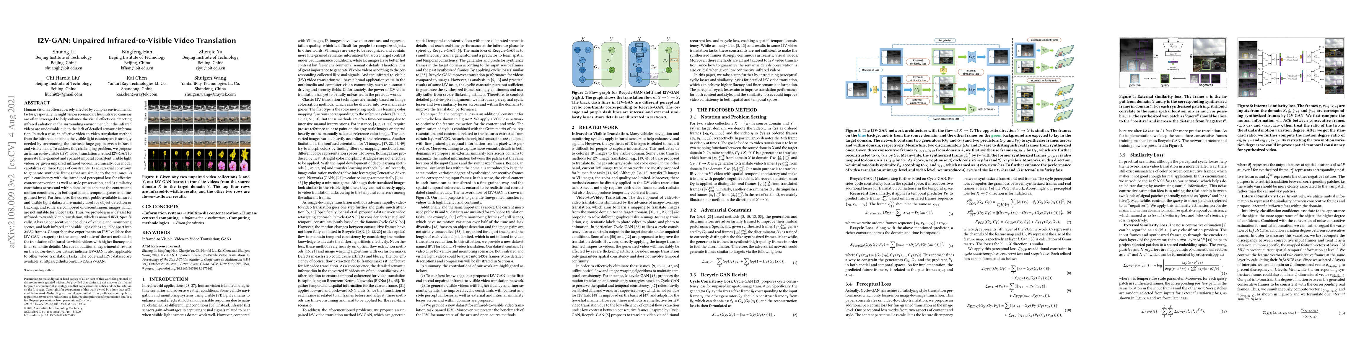 The I2V-GAN method proposes an unpaired infrared-to-visible video translation technique to generate fine-grained and temporally consistent visible light videos from infrared inputs. The model leverages adversarial, cyclic consistency, and similarity constraints to achieve high-quality translations, and introduces a new dataset, IRVI, for this purpose.