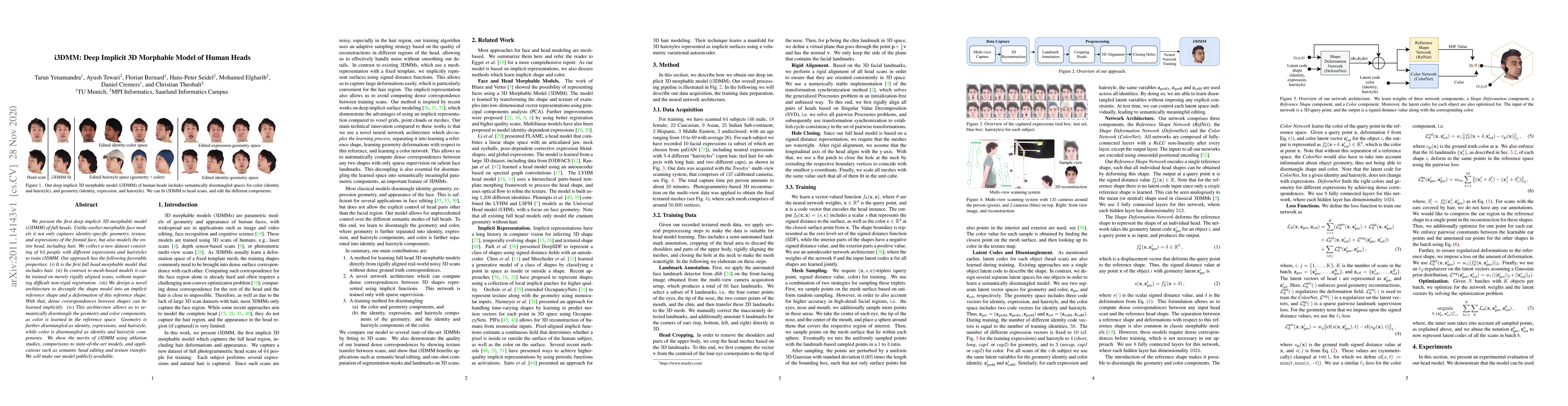 The i3DMM is a novel deep implicit 3D morphable model that captures the entire head, including hair, and can be trained on rigidly aligned scans without non-rigid registration. This model disentangles geometry and color components, allowing for semantic head editing and texture transfer.