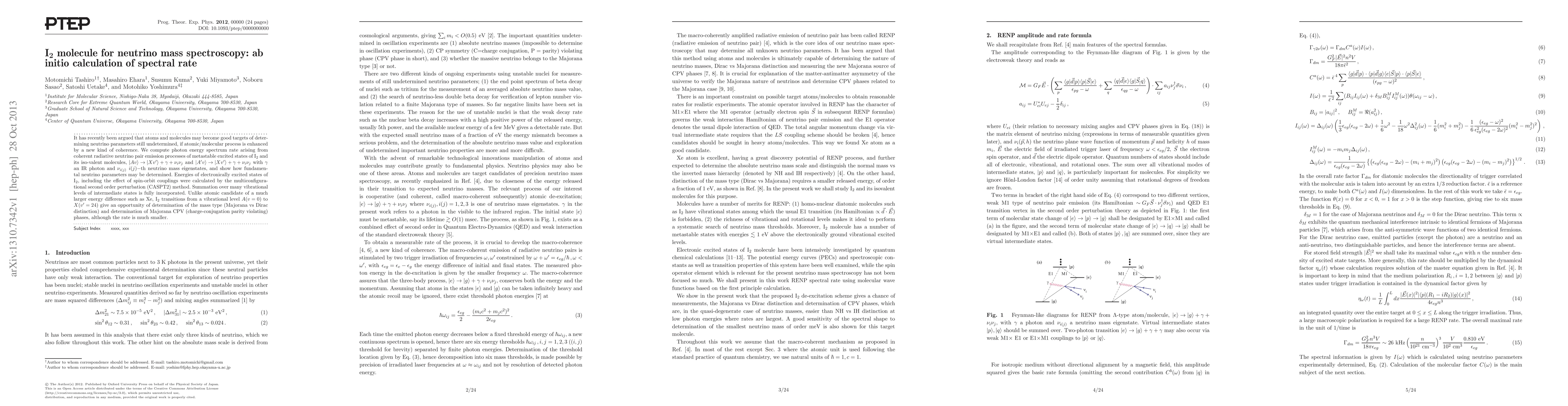 It has recently been argued that atoms and molecules may become good targets of determining neutrino parameters still undetermined, if atomic/molecular process is enhanced by a new kind of coherence. We compute photon energy spectrum rate arising from coherent radiative neutrino pair emission processes of metastable excited states of I$_2$ and its iso-valent molecules, $|Av \rangle \rightarrow |Xv' \rangle + \gamma + \nu_i\nu_j$ and $|A'v \rangle \rightarrow |Xv' \rangle + \gamma + \nu_i\nu_j$ with $\gamma$ an IR photon and $\nu_{i(j)}$ $i(j)-$th neutrino mass eigenstates, and show how fundamental neutrino parameters may be determined. Energies of electronically excited states of I$_2$, including the effect of spin-orbit couplings were calculated by the multiconfigurational second order perturbation (CASPT2) method. Summation over many vibrational levels of intermediate states is fully incorporated. Unlike atomic candidate of a much larger energy difference such as Xe, I$_2$ transitions from a vibrational level $A(v=0)$ to $X(v' = 24)$ give an opportunity of determination of the mass type (Majorana vs Dirac distinction) and determination of Majorana CPV (charge-conjugation parity violating) phases, although the rate is much smaller.