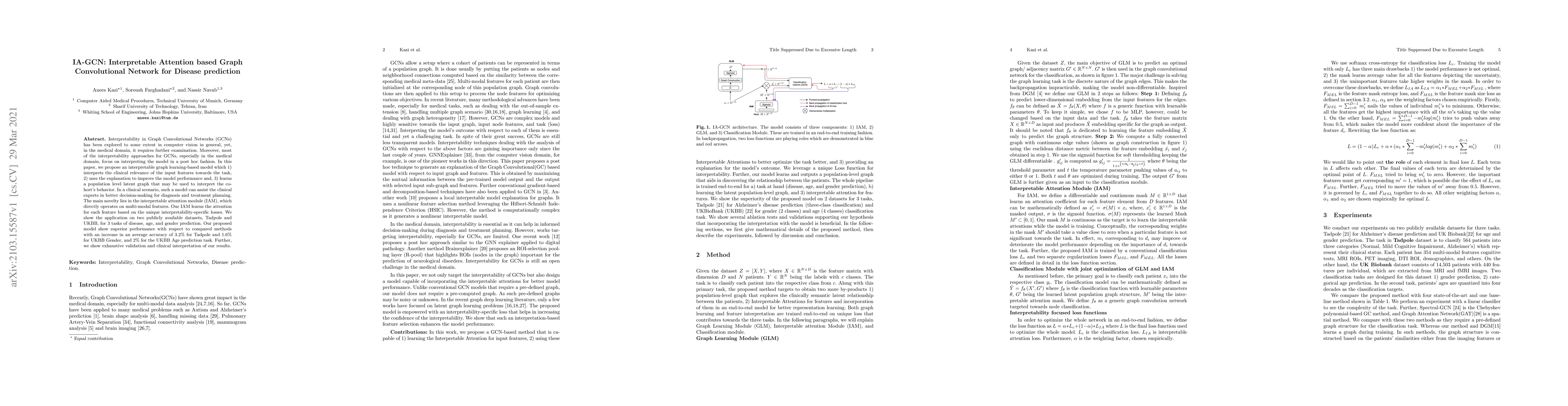 Interpretability in Graph Convolutional Networks (GCNs) has been explored to some extent in computer vision in general, yet, in the medical domain, it requires further examination. Moreover, most of the interpretability approaches for GCNs, especially in the medical domain, focus on interpreting the model in a post hoc fashion. In this paper, we propose an interpretable graph learning-based model which 1) interprets the clinical relevance of the input features towards the task, 2) uses the explanation to improve the model performance and, 3) learns a population level latent graph that may be used to interpret the cohort's behavior. In a clinical scenario, such a model can assist the clinical experts in better decision-making for diagnosis and treatment planning. The main novelty lies in the interpretable attention module (IAM), which directly operates on multi-modal features. Our IAM learns the attention for each feature based on the unique interpretability-specific losses. We show the application on two publicly available datasets, Tadpole and UKBB, for three tasks of disease, age, and gender prediction. Our proposed model shows superior performance with respect to compared methods with an increase in an average accuracy of 3.2% for Tadpole, 1.6% for UKBB Gender, and 2% for the UKBB Age prediction task. Further, we show exhaustive validation and clinical interpretation of our results.
