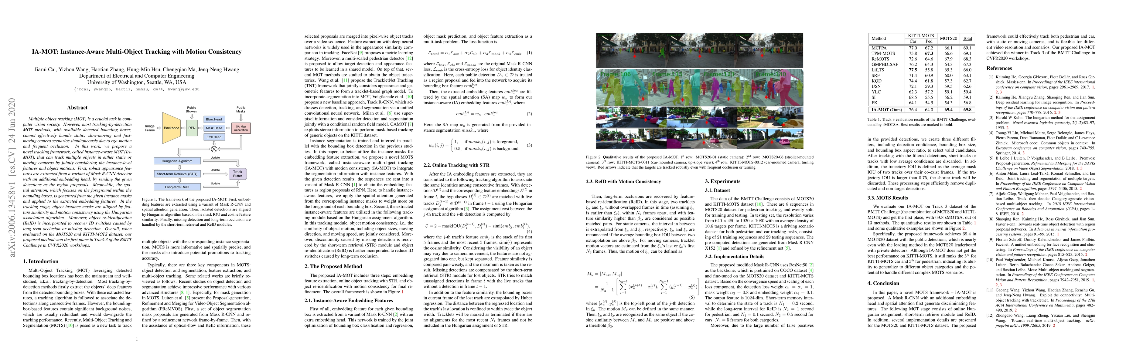 The paper proposes a novel "instance-aware MOT" (IA-MOT) framework for multi-object tracking that leverages instance-level features and motion consistency to handle static and dynamic camera scenarios. The method integrates robust appearance features from a modified Mask R-CNN and spatial attention from instance masks, achieving top performance in the BMTT Challenge.