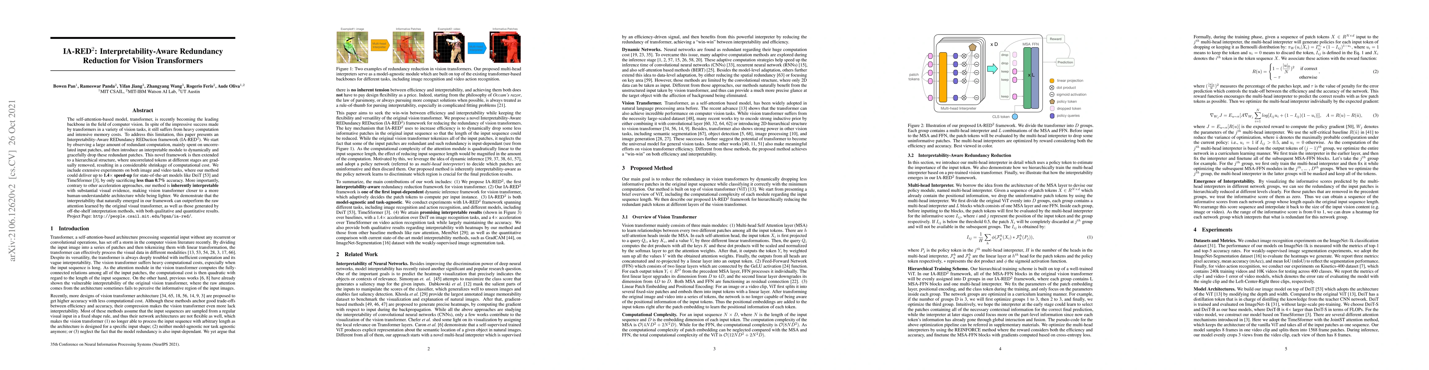 This paper introduces IA-RED$^2$, an interpretability-aware framework for reducing redundancy in vision transformers, achieving up to 1.4x speed-up with less than 0.7% loss in accuracy. The method dynamically removes uncorrelated input patches and extends to a hierarchical structure, offering substantial computational savings while maintaining interpretability and outperforming raw attention mechanisms.