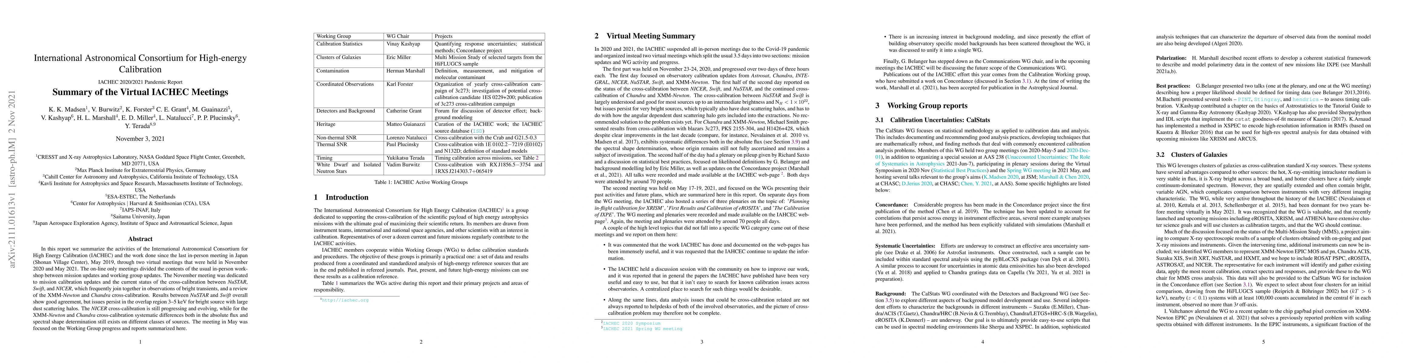 In this report we summarize the activities of the International Astronomical Consortium for High Energy Calibration (IACHEC) and the work done since the last in-person meeting in Japan (Shonan Village Center), May 2019, through two virtual meetings that were held in November 2020 and May 2021. The on-line only meetings divided the contents of the usual in-person workshop between mission updates and working group updates. The November meeting was dedicated to mission calibration updates and the current status of the cross-calibration between NuSTAR, Swift, and NICER, which frequently join together in observations of bright transients, and a review of the XMM-Newton and Chandra cross-calibration. Results between \nustar\ and \swift\ overall show good agreement, but issues persist in the overlap region 3--5 keV for bright source with large dust scattering halos. The NICER cross-calibration is still progressing and evolving, while for the XMM-Newton and Chandra cross-calibration systematic differences both in the absolute flux and spectral shape determination still exists on different classes of sources. The meeting in May was focused on the Working Group progress and reports summarized here.