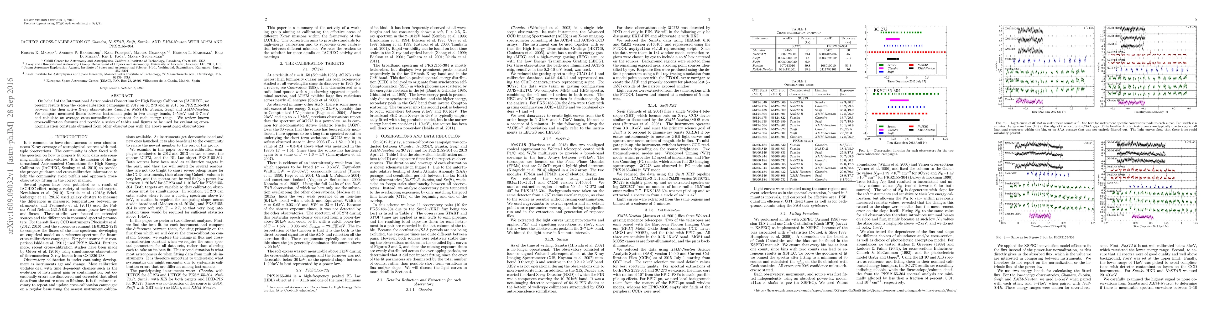 The paper reports on cross-calibration efforts by the International Astronomical Consortium for High Energy Calibration (IACHEC) between Chandra, NuSTAR, Swift, Suzaku, and XMM-Newton using 3C 273 and PKS 2155-304. It provides average cross-normalization constants for 1-5 keV and 3-7 keV energy bands, and includes tables and figures for future evaluations of these calibrations.