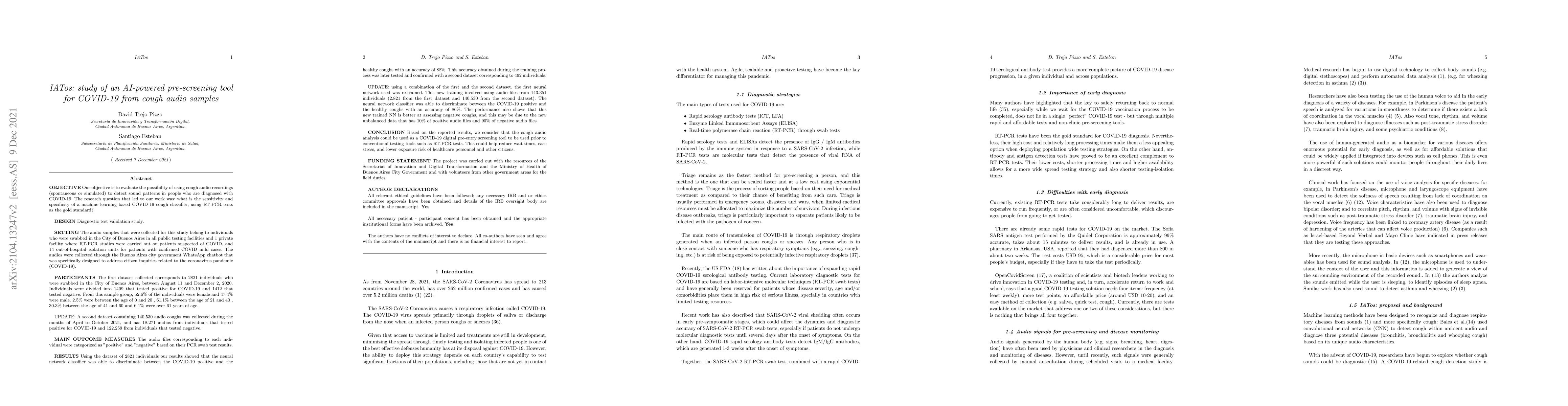 OBJECTIVE: Our objective is to evaluate the possibility of using cough audio recordings (spontaneous or simulated) to detect sound patterns in people who are diagnosed with COVID-19. The research question that led our work was: what is the sensitivity and specificity of a machine learning based COVID-19 cough classifier, using RT-PCR tests as gold standard? SETTING: The audio samples that were collected for this study belong to individuals who were swabbed in the City of Buenos Aires in 20 public and 1 private facilities where RT-PCR studies were carried out on patients suspected of COVID, and 14 out-of-hospital isolation units for patients with confirmed COVID mild cases. The audios were collected through the Buenos Aires city government WhatsApp chatbot that was specifically designed to address citizen inquiries related to the coronavirus pandemic (COVID-19). PARTICIPANTS: The data collected corresponds to 2821 individuals who were swabbed in the City of Buenos Aires, between August 11 and December 2, 2020. Individuals were divided into 1409 that tested positive for COVID-19 and 1412 that tested negative. From this sample group, 52.6% of the individuals were female and 47.4% were male. 2.5% were between the age of 0 and 20 , 61.1% between the age of 21 and 40 , 30.3% between the age of 41 and 60 and 6.1% were over 61 years of age. RESULTS: Using the dataset of 2821 individuals our results showed that the neural network classifier was able to discriminate between the COVID-19 positive and the healthy coughs with an accuracy of 86%. This accuracy obtained during the training process was later tested and confirmed with a second dataset corresponding to 492 individuals.