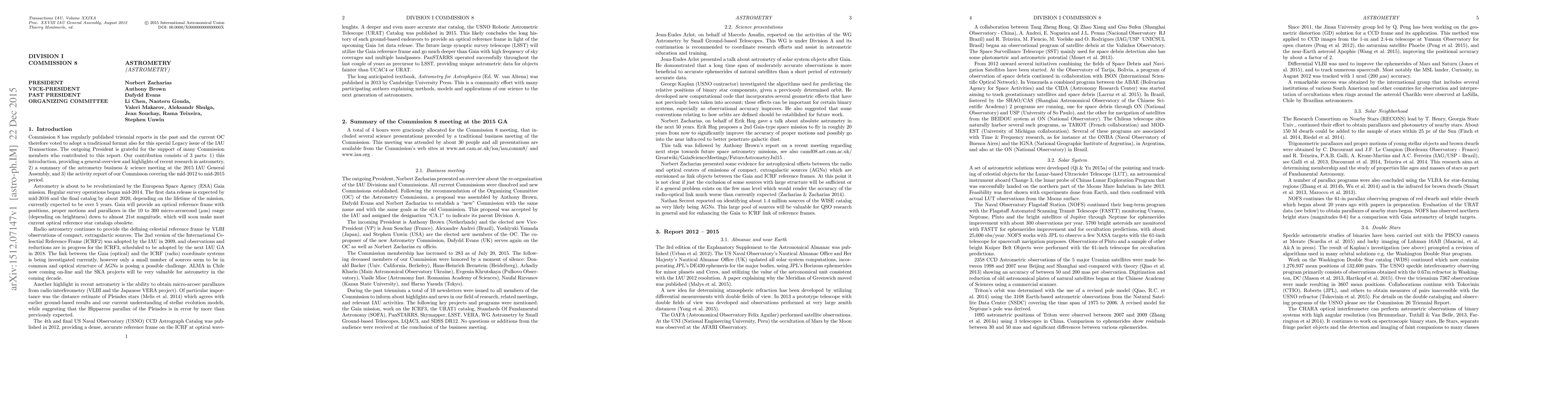 This report summarizes the activities of IAU Commission 8 on Astrometry from 2012 to 2015, including an overview of recent research highlights, a summary of the 2015 IAU General Assembly meeting, and an activity report on the commission's work during this period. The outgoing President acknowledges the contributions of many commission members.