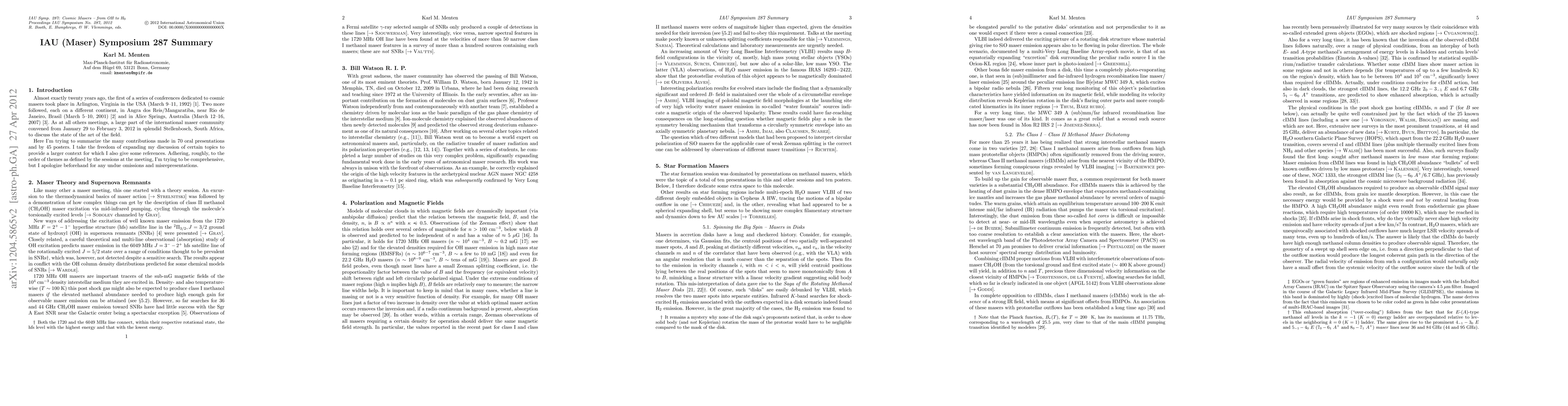 I'm trying to summarize the science communicated via oral presentations and by posters at the IAU Symposium 287 "Cosmic Masers - from OH to H_0", which took place from January 29 to February 3, 2012 in Stellenbosch, South Africa.