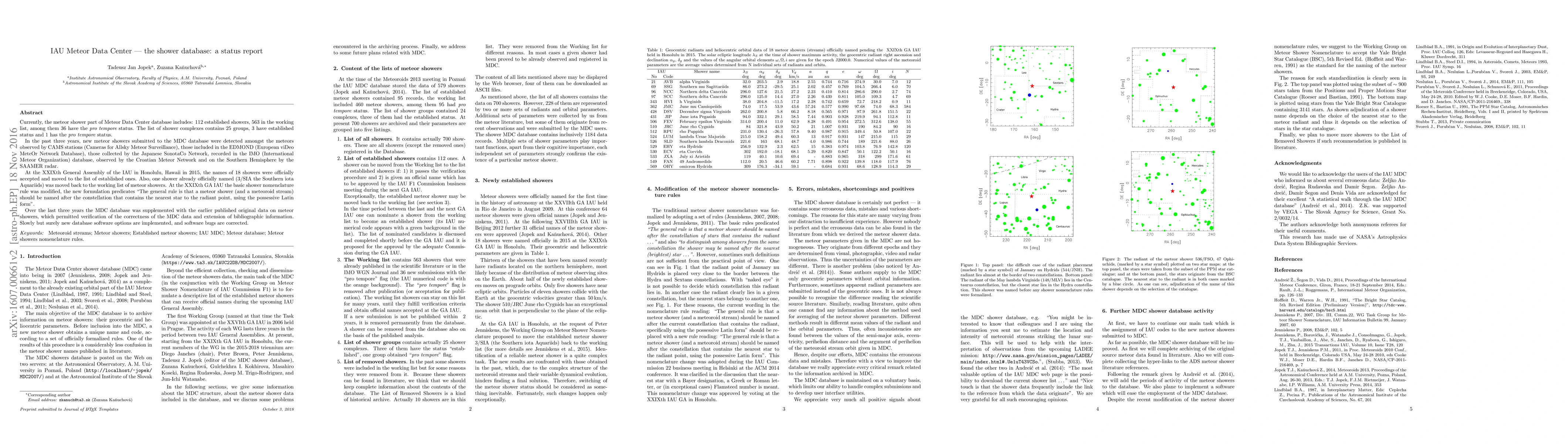 The IAU Meteor Data Center's shower database now includes 112 established meteor showers, 563 in the working list, and 25 shower complexes. Recent additions and updates were sourced from various global networks, and new nomenclature rules were adopted at the XXIXth General Assembly of the IAU in 2015.