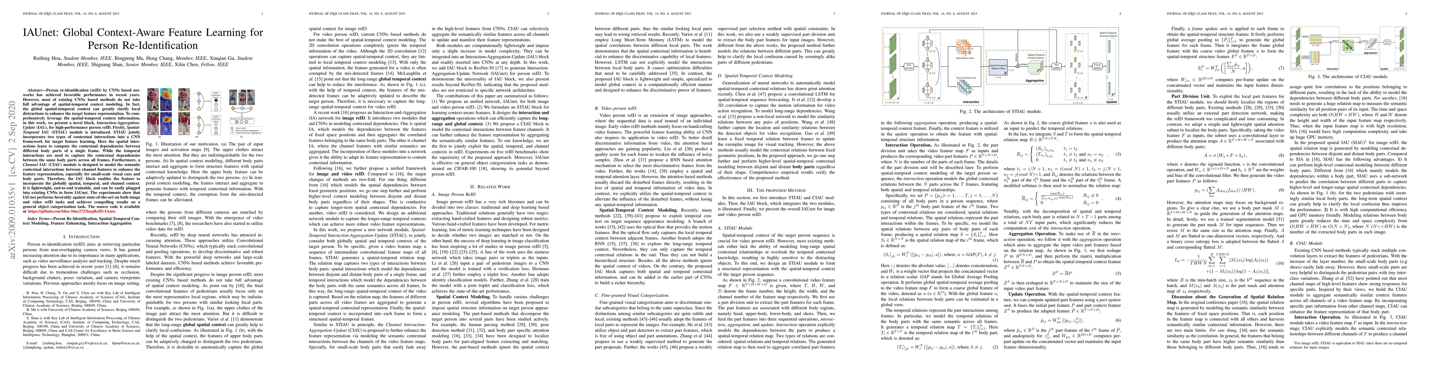 This paper introduces a novel block called Interaction-Aggregation-Update (IAU) that leverages global spatial-temporal context to improve person re-identification performance in images and videos.