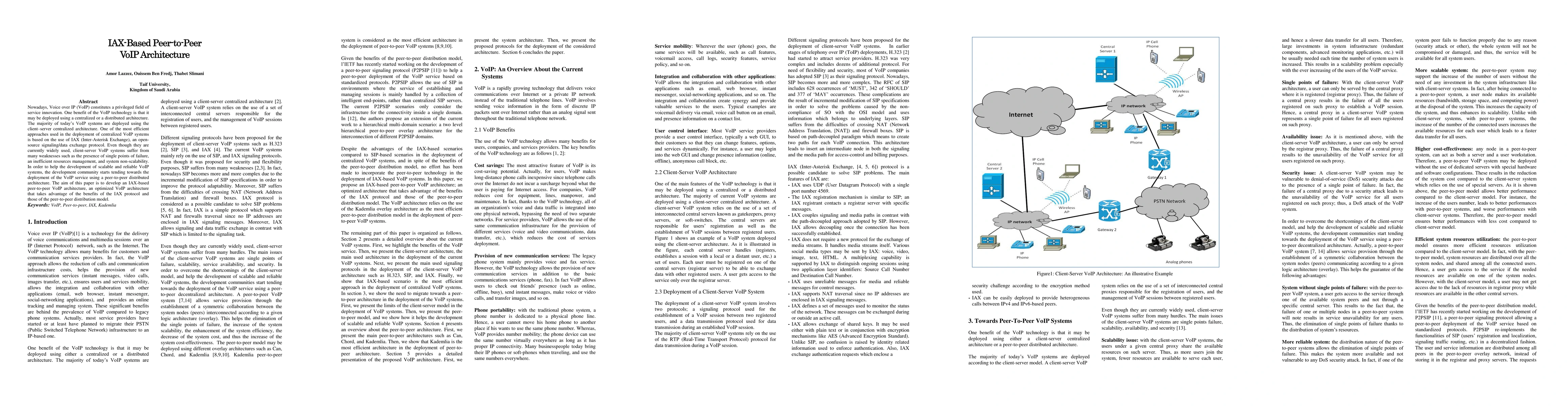 This paper proposes an IAX-based peer-to-peer VoIP architecture to overcome the weaknesses of centralized client-server models, aiming to enhance scalability, reliability, and resource management in VoIP services.