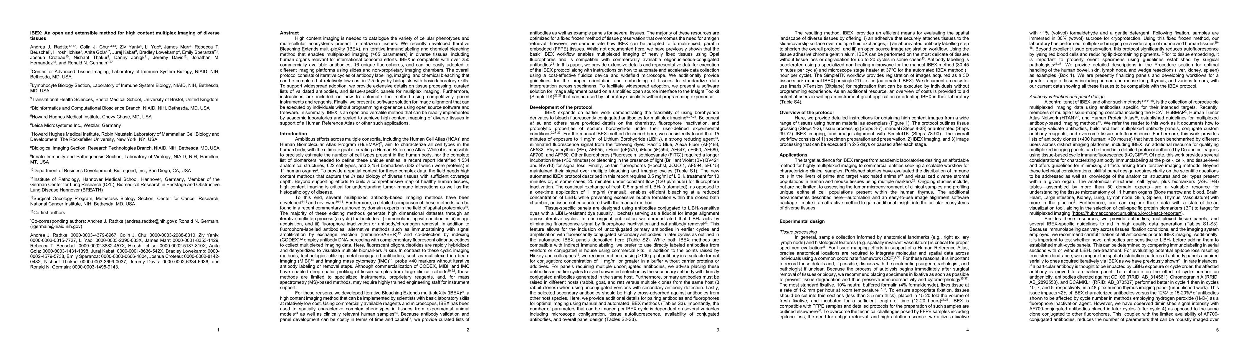 IBEX is an open and extensible method for high content multiplex imaging of diverse tissues, enabling >65 parameters using iterative immunolabeling and chemical bleaching. It supports over 250 antibodies and 16 fluorophores, and is easily adaptable to various imaging platforms.
