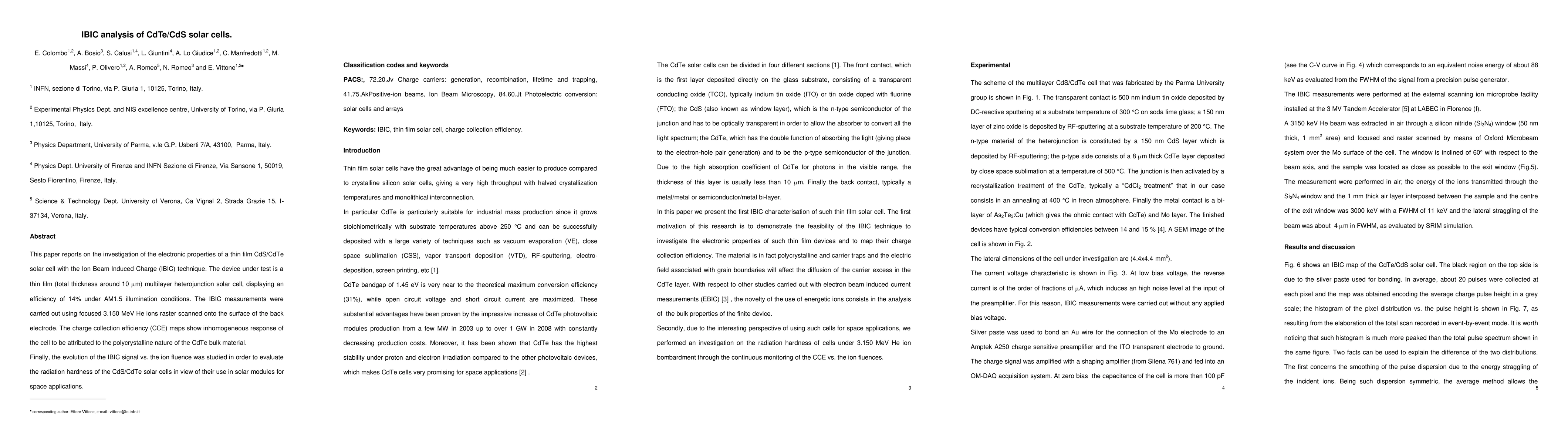 This paper investigates the electronic properties of a thin film CdS/CdTe solar cell using IBIC, revealing inhomogeneous charge collection efficiency due to the polycrystalline CdTe. The study also assesses the radiation hardness of the solar cell for potential space applications.