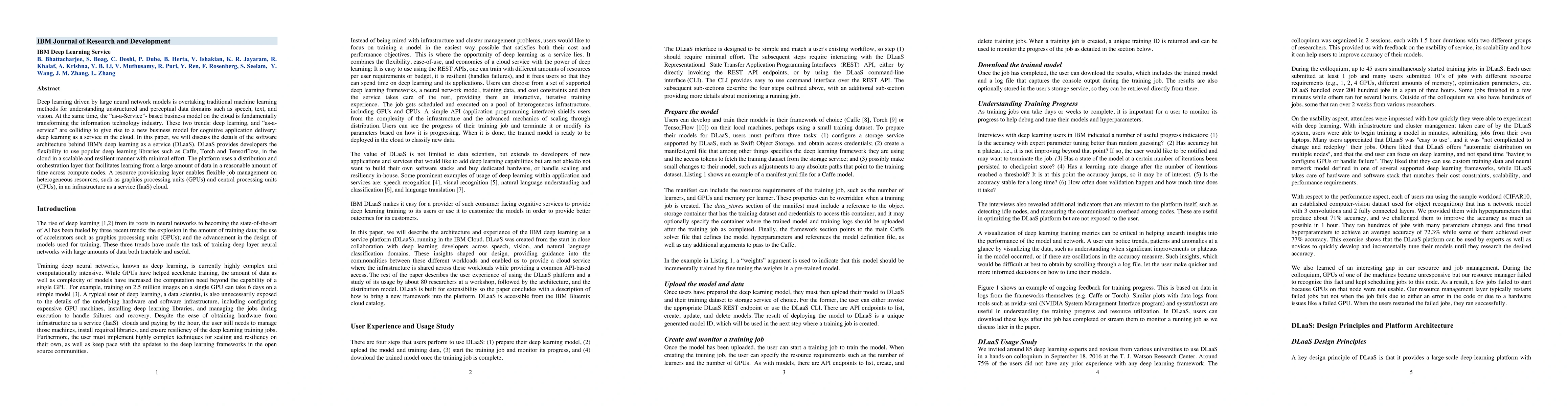 IBM Deep Learning Service offers a cloud-based platform for flexible deep learning model deployment with minimal effort, revolutionizing cognitive application delivery. This service provides scalable and resilient access to popular deep learning libraries via a distribution and orchestration layer.