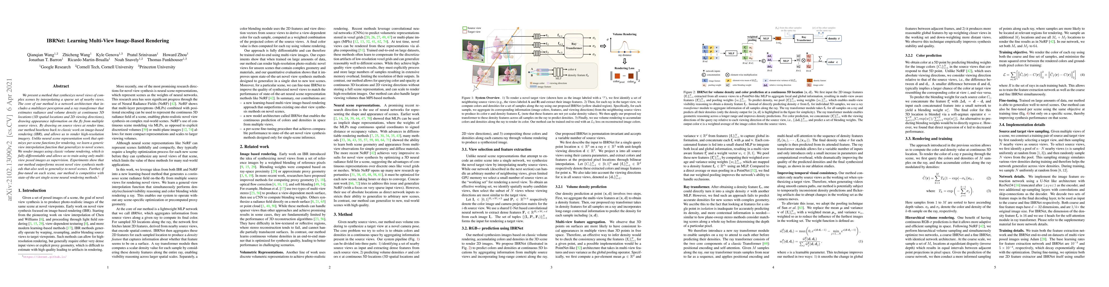 This paper introduces IBRNet, a method for synthesizing novel views of complex scenes by interpolating a sparse set of nearby views using a ray transformer network. The method outperforms recent methods in view synthesis while being competitive with state-of-the-art single-scene neural rendering methods.