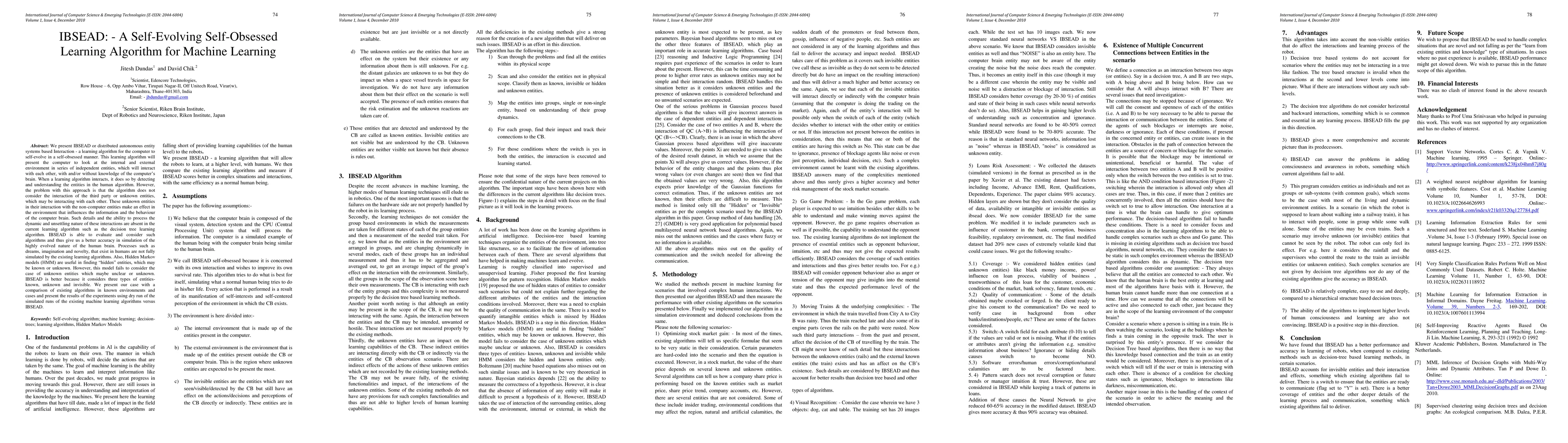 We present IBSEAD or distributed autonomous entity systems based Interaction - a learning algorithm for the computer to self-evolve in a self-obsessed manner. This learning algorithm will present the computer to look at the internal and external environment in series of independent entities, which will interact with each other, with and/or without knowledge of the computer's brain. When a learning algorithm interacts, it does so by detecting and understanding the entities in the human algorithm. However, the problem with this approach is that the algorithm does not consider the interaction of the third party or unknown entities, which may be interacting with each other. These unknown entities in their interaction with the non-computer entities make an effect in the environment that influences the information and the behaviour of the computer brain. Such details and the ability to process the dynamic and unsettling nature of these interactions are absent in the current learning algorithm such as the decision tree learning algorithm. IBSEAD is able to evaluate and consider such algorithms and thus give us a better accuracy in simulation of the highly evolved nature of the human brain. Processes such as dreams, imagination and novelty, that exist in humans are not fully simulated by the existing learning algorithms. Also, Hidden Markov models (HMM) are useful in finding "hidden" entities, which may be known or unknown. However, this model fails to consider the case of unknown entities which maybe unclear or unknown. IBSEAD is better because it considers three types of entities- known, unknown and invisible. We present our case with a comparison of existing algorithms in known environments and cases and present the results of the experiments using dry run of the simulated runs of the existing machine learning algorithms versus IBSEAD.