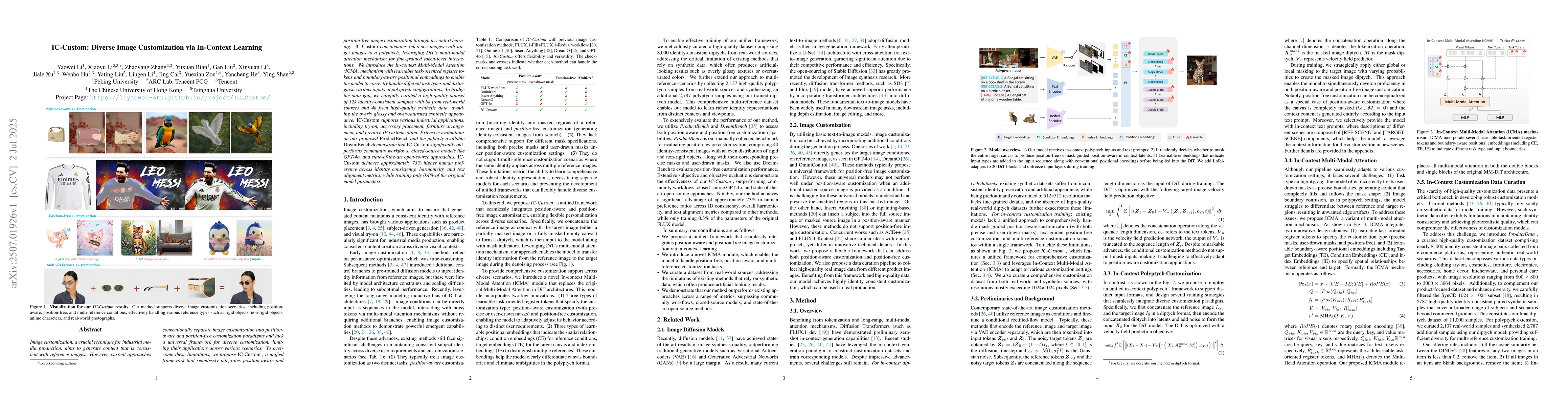 Image customization, a crucial technique for industrial media production, aims to generate content that is consistent with reference images. However, current approaches conventionally separate image customization into position-aware and position-free customization paradigms and lack a universal framework for diverse customization, limiting their applications across various scenarios. To overcome these limitations, we propose IC-Custom, a unified framework that seamlessly integrates position-aware and position-free image customization through in-context learning. IC-Custom concatenates reference images with target images to a polyptych, leveraging DiT's multi-modal attention mechanism for fine-grained token-level interactions. We introduce the In-context Multi-Modal Attention (ICMA) mechanism with learnable task-oriented register tokens and boundary-aware positional embeddings to enable the model to correctly handle different task types and distinguish various inputs in polyptych configurations. To bridge the data gap, we carefully curated a high-quality dataset of 12k identity-consistent samples with 8k from real-world sources and 4k from high-quality synthetic data, avoiding the overly glossy and over-saturated synthetic appearance. IC-Custom supports various industrial applications, including try-on, accessory placement, furniture arrangement, and creative IP customization. Extensive evaluations on our proposed ProductBench and the publicly available DreamBench demonstrate that IC-Custom significantly outperforms community workflows, closed-source models, and state-of-the-art open-source approaches. IC-Custom achieves approximately 73% higher human preference across identity consistency, harmonicity, and text alignment metrics, while training only 0.4% of the original model parameters. Project page: https://liyaowei-stu.github.io/project/IC_Custom