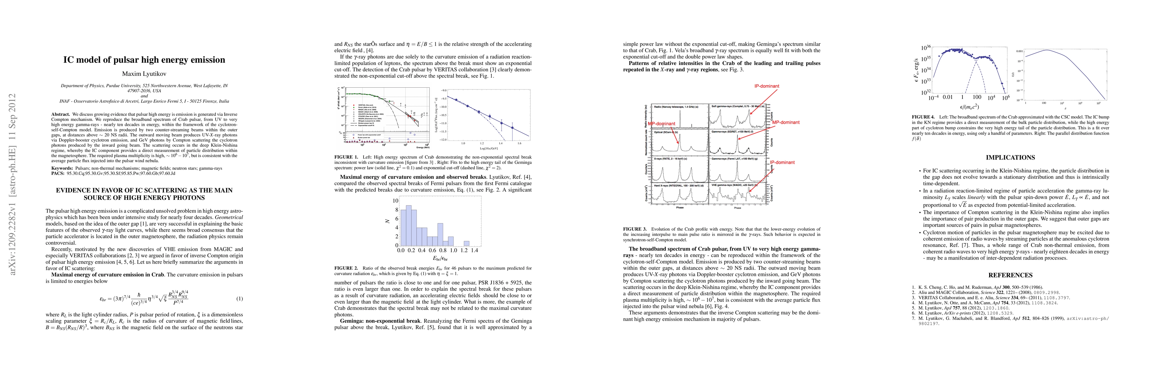 We discuss growing evidence that pulsar high energy is emission is generated via Inverse Compton mechanism. We reproduce the broadband spectrum of Crab pulsar, from UV to very high energy gamma-rays - nearly ten decades in energy, within the framework of the cyclotron-self-Compton model. Emission is produced by two counter-streaming beams within the outer gaps, at distances above ~ 20 NS radii. The outward moving beam produces UV-X-ray photons via Doppler-booster cyclotron emission, and GeV photons by Compton scattering the cyclotron photons produced by the inward going beam. The scattering occurs in the deep Klein-Nishina regime, whereby the IC component provides a direct measurement of particle distribution within the magnetosphere. The required plasma multiplicity is high, ~ 10^6-10^7, but is consistent with the average particle flux injected into the pulsar wind nebula.
