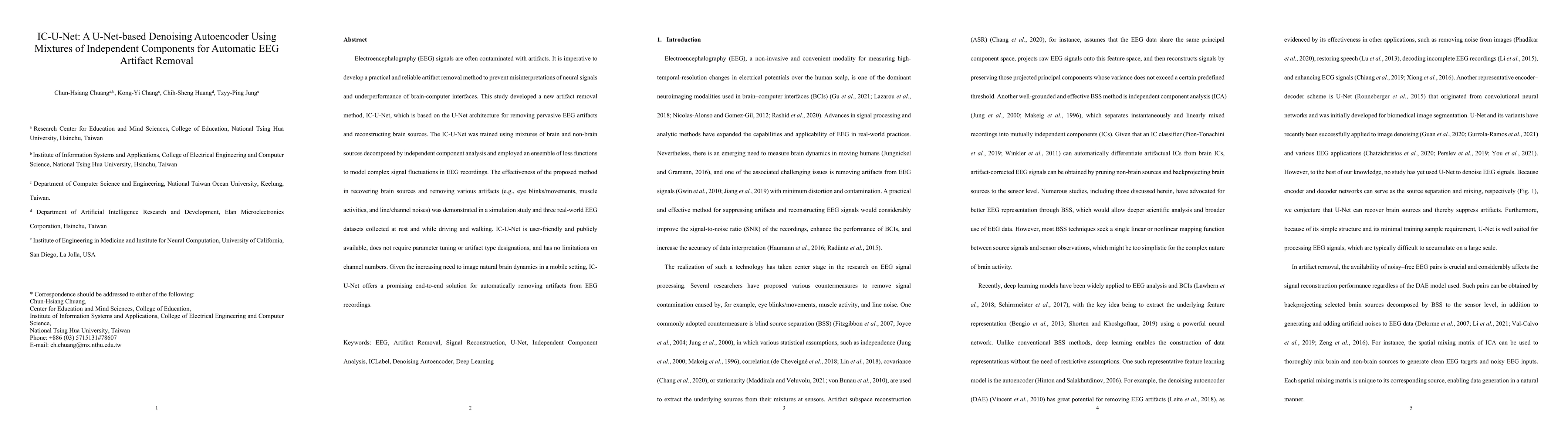IC-U-Net is a novel U-Net-based denoising autoencoder that leverages mixtures of independent components for automatic EEG artifact removal, demonstrating effectiveness across various real-world datasets without requiring parameter tuning or specific artifact type designations. The method offers a practical solution for enhancing brain-computer interfaces by accurately reconstructing brain sources.