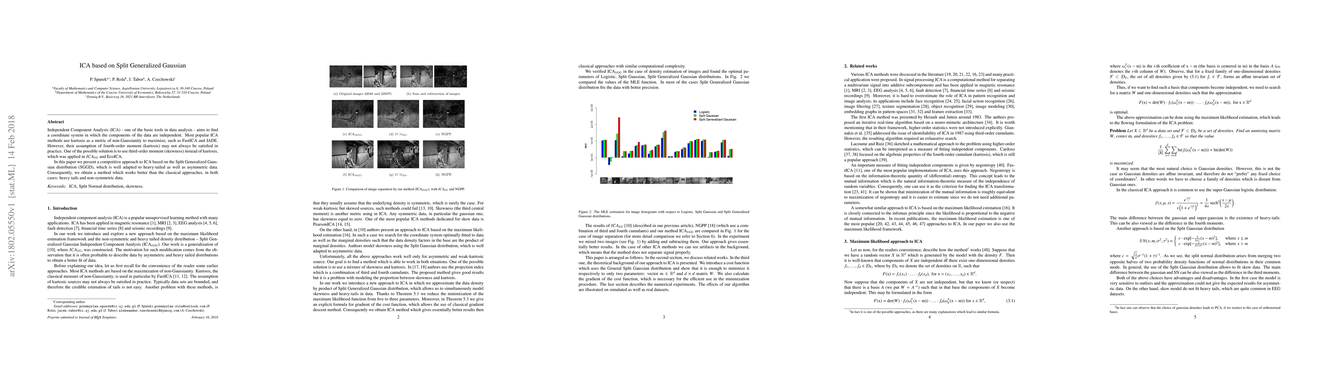 Independent Component Analysis (ICA) - one of the basic tools in data analysis - aims to find a coordinate system in which the components of the data are independent. Most popular ICA methods use kurtosis as a metric of non-Gaussianity to maximize, such as FastICA and JADE. However, their assumption of fourth-order moment (kurtosis) may not always be satisfied in practice. One of the possible solution is to use third-order moment (skewness) instead of kurtosis, which was applied in $ICA_{SG}$ and EcoICA. In this paper we present a competitive approach to ICA based on the Split Generalized Gaussian distribution (SGGD), which is well adapted to heavy-tailed as well as asymmetric data. Consequently, we obtain a method which works better than the classical approaches, in both cases: heavy tails and non-symmetric data. \end{abstract}