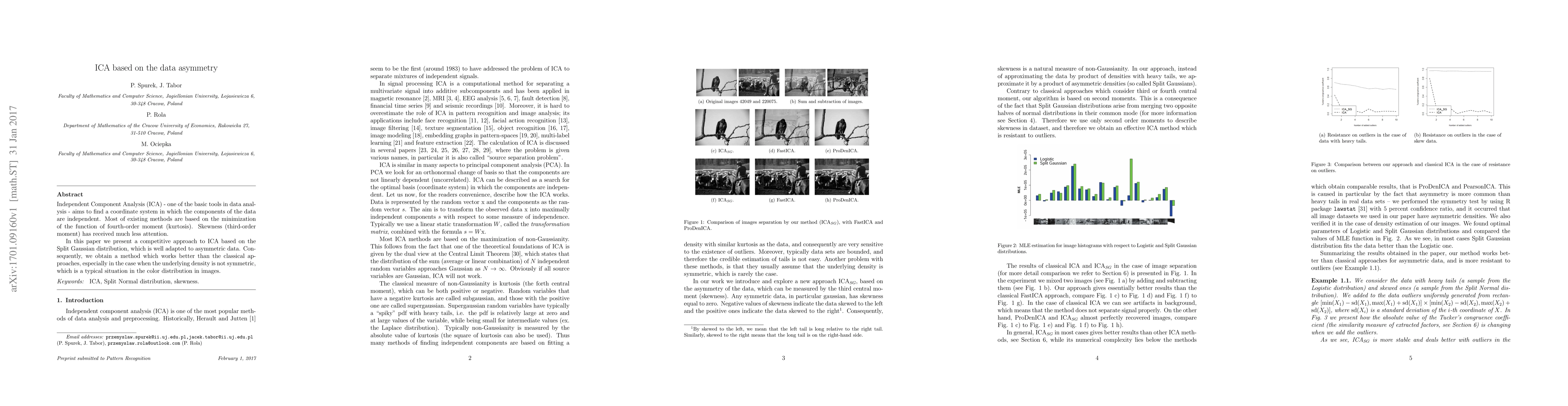 Independent Component Analysis (ICA) - one of the basic tools in data analysis - aims to find a coordinate system in which the components of the data are independent. Most of existing methods are based on the minimization of the function of fourth-order moment (kurtosis). Skewness (third-order moment) has received much less attention. In this paper we present a competitive approach to ICA based on the Split Gaussian distribution, which is well adapted to asymmetric data. Consequently, we obtain a method which works better than the classical approaches, especially in the case when the underlying density is not symmetric, which is a typical situation in the color distribution in images.