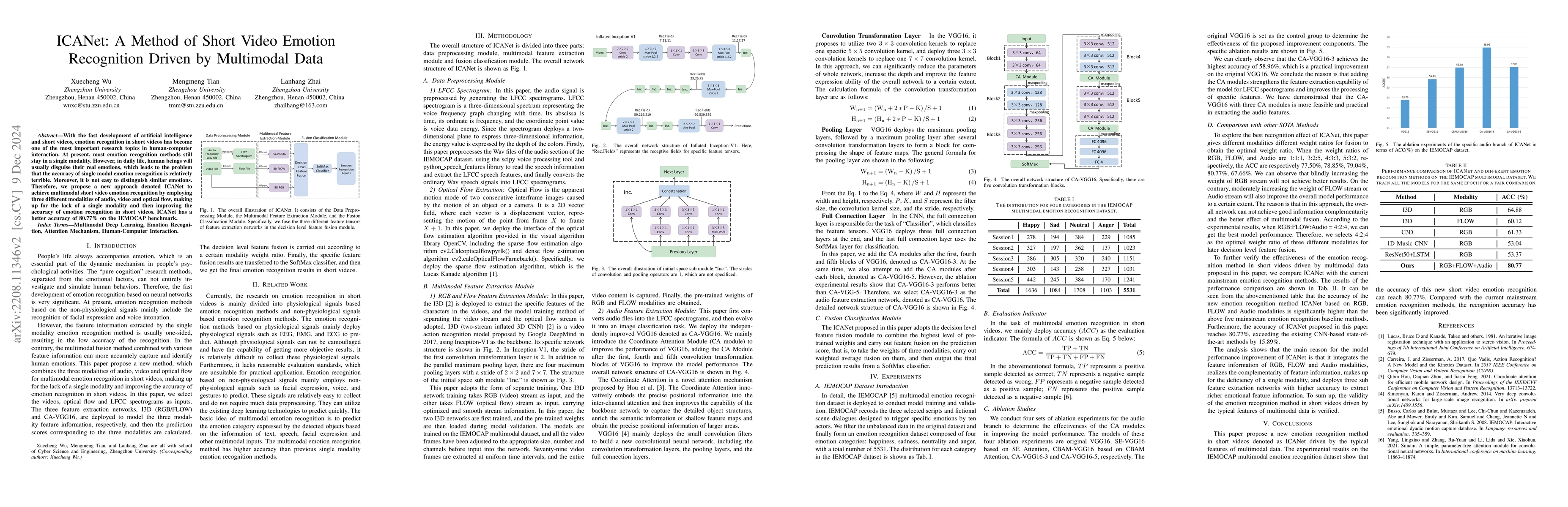 ICANet is a novel multimodal approach for short video emotion recognition using audio, video, and optical flow data, achieving an accuracy of 80.77% on the IEMOCAP dataset, surpassing existing single-modality methods by 15.89%.