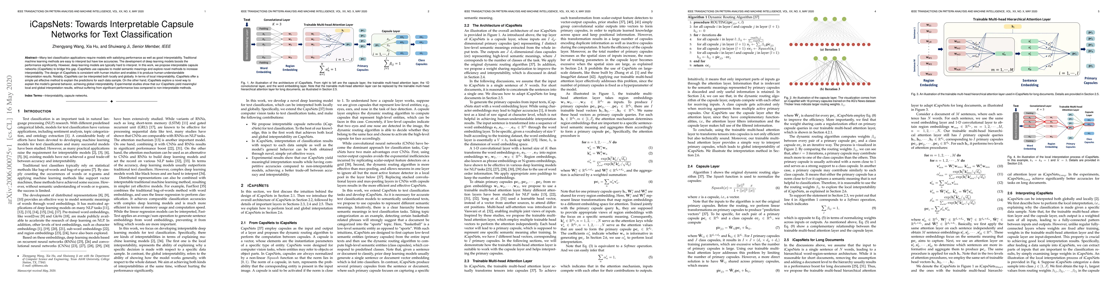This paper proposes interpretable capsule networks (iCapsNets) for text classification, aiming to bridge the gap between high performance and interpretability. iCapsNets utilize capsules to model semantic meanings and offer both local and global interpretability, maintaining competitive performance compared to non-interpretable methods.