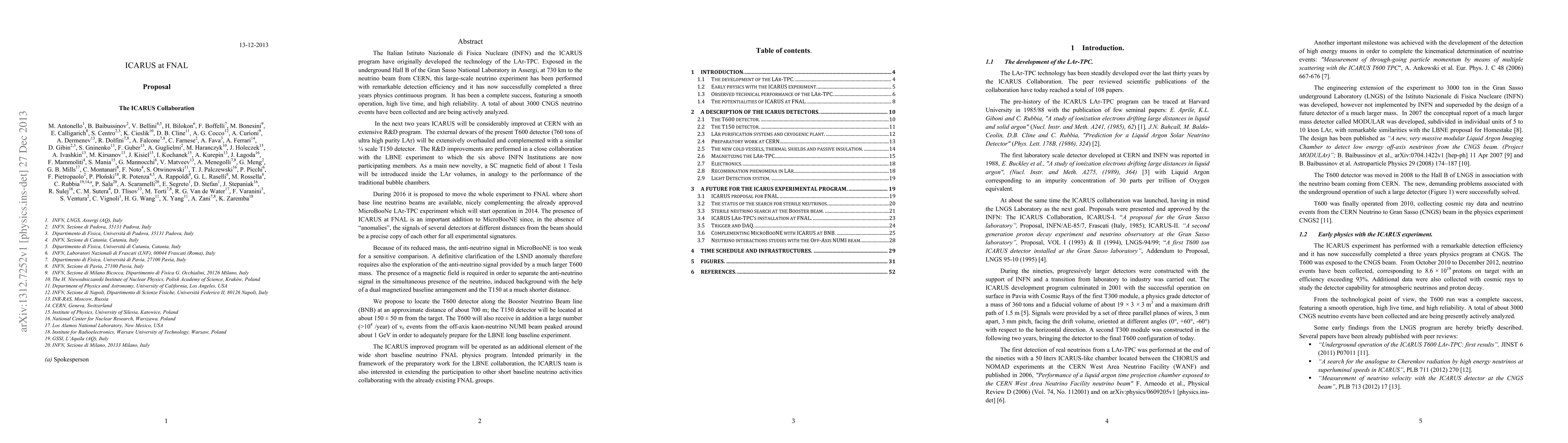 The INFN and the ICARUS collaboration originally developed the technology of the LAr-TPC. Located the underground LNGS Hall-B, the ICARUS T600 detector has been performed over three years with remarkable detection efficiency featuring a smooth operation, high live time, and high reliability. About 3000 CNGS neutrino events have been collected and are being actively analyzed. ICARUS will now be moved to CERN for an extensive R&D program. The T600 detector will be overhauled and complemented with a similar T150 detector. These improvements are performed in collaboration with the LBNE experiment, of which several INFN Institutions are now members. As a novelty, a SC magnetic field of about 1 T will be introduced. During 2016 it is proposed to move the experiment to FNAL where short base line neutrino beams are available, complementing the approved MicroBooNe experiment which will start operation in 2014. The ICARUS detectors at FNAL will be an important addition since, in absence of anomalies, the signals of several detectors at different distances from the target should be a copy of each other for all experimental signatures. Due to the reduced mass, in MicroBooNE the anti-neutrino signal is too weak for a sensitive comparison. Hence, a definitive clarification of the LSND anomaly requires the exploration of the anti-neutrino signal provided by the much larger T600. The magnetic field will allow separating the anti-neutrino signal from the neutrino-induced background. It is proposed to expose the T600 at the Booster NuBeam at ~700 m from target; the T150 will be located at ~150 m. The T600 will also receive >10^4 nu_e events/year from the off-axis NUMI beam peaked around 1 GeV and exploitable to prepare for the LBNE experiment. The ICARUS teams are also interested in extending the participation to other short baseline neutrino activities collaborating with existing FNAL groups.