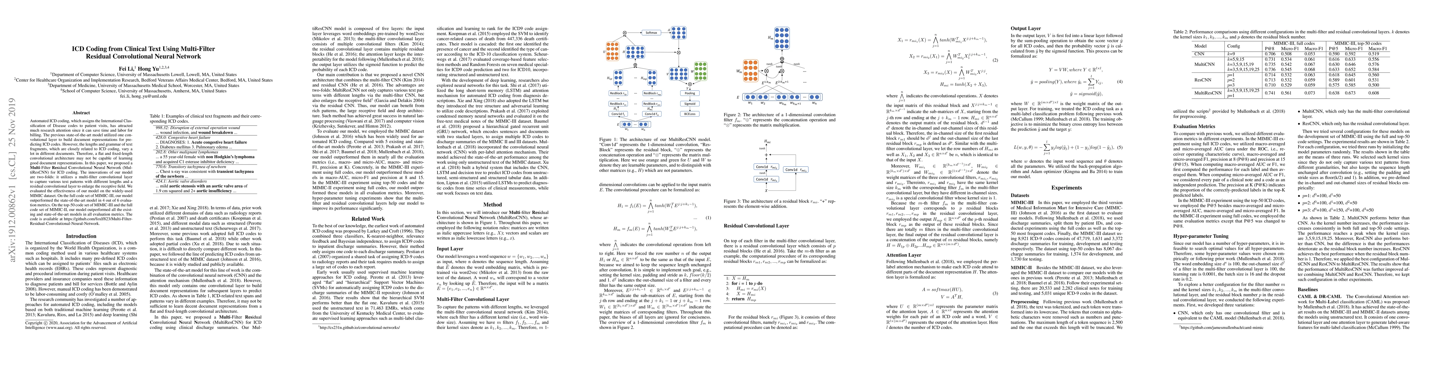 This paper proposes a Multi-Filter Residual Convolutional Neural Network (MultiResCNN) to improve automated ICD coding from clinical text. The model uses multi-filter convolutions and residual layers to better capture varied text patterns and enhance representation learning, outperforming existing models on multiple evaluation metrics across MIMIC datasets.