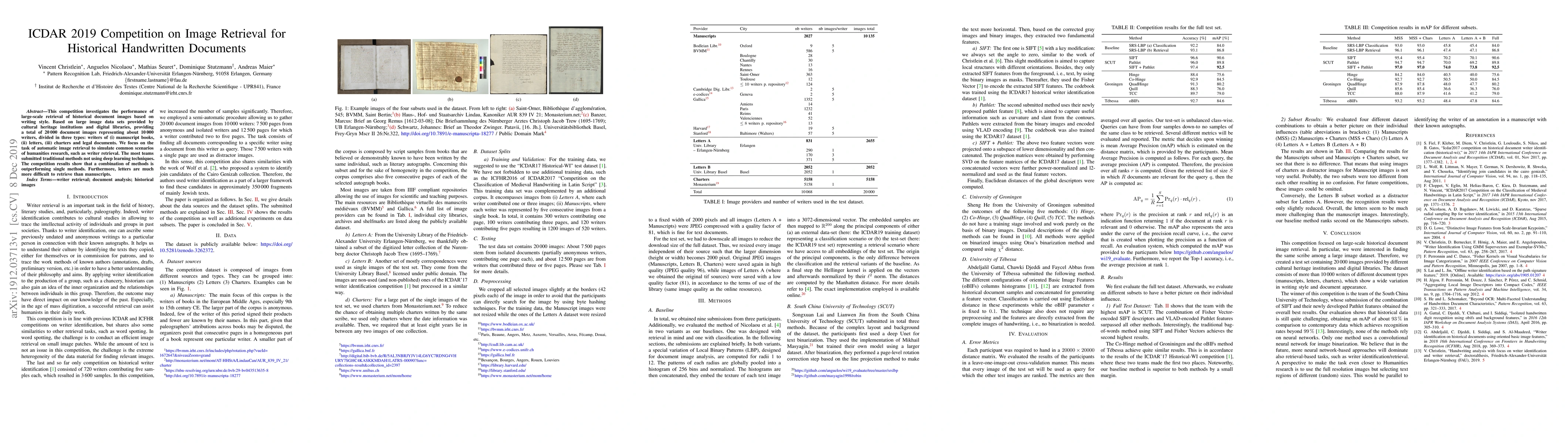 The ICDAR 2019 Competition focused on large-scale retrieval of historical handwritten document images based on writing style. The dataset consisted of 20,000 images from over 10,000 writers, categorized into manuscripts, letters, and charters. Participants submitted methods for image retrieval, with a combination of techniques outperforming single methods.