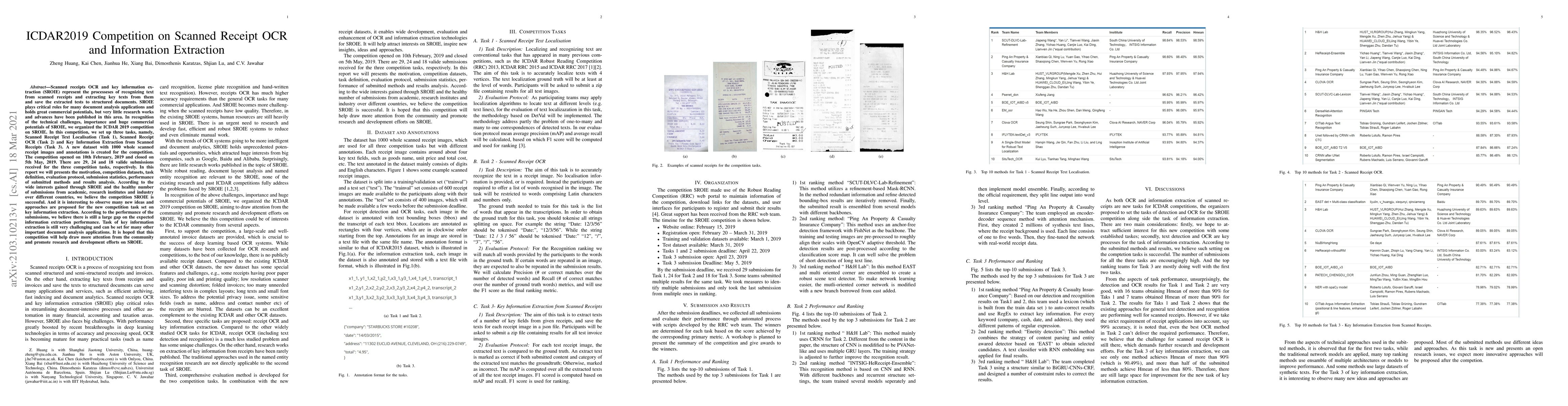 The ICDAR 2019 competition on SROIE aimed to advance the recognition and extraction of text from scanned receipts, addressing a largely under-researched field with significant commercial potential. The competition included three tasks: text localization, OCR, and key information extraction, using a new dataset of 1000 annotated receipt images.