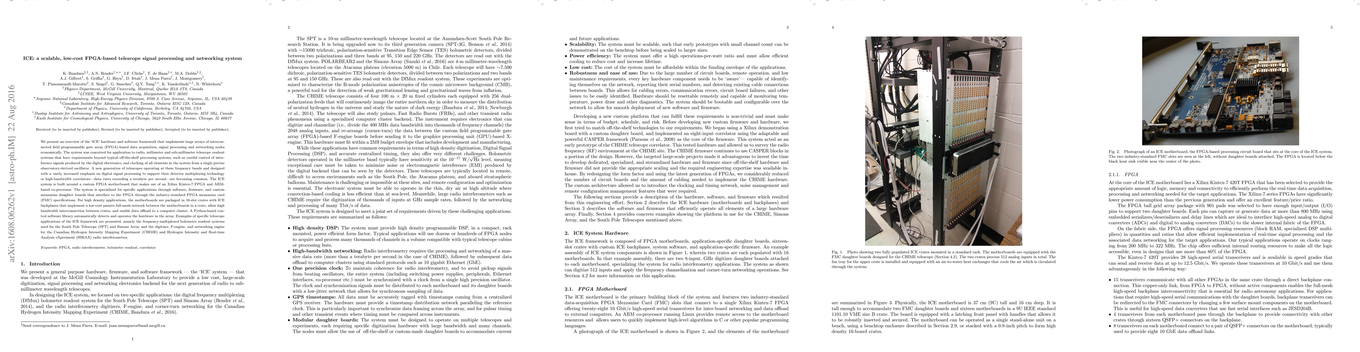 We present an overview of the 'ICE' hardware and software framework that implements large arrays of interconnected FPGA-based data acquisition, signal processing and networking nodes economically. The system was conceived for application to radio, millimeter and sub-millimeter telescope readout systems that have requirements beyond typical off-the-shelf processing systems, such as careful control of interference signals produced by the digital electronics, and clocking of all elements in the system from a single precise observatory-derived oscillator. A new generation of telescopes operating at these frequency bands and designed with a vastly increased emphasis on digital signal processing to support their detector multiplexing technology or high-bandwidth correlators---data rates exceeding a terabyte per second---are becoming common. The ICE system is built around a custom FPGA motherboard that makes use of an Xilinx Kintex-7 FPGA and ARM-based co-processor. The system is specialized for specific applications through software, firmware, and custom mezzanine daughter boards that interface to the FPGA through the industry-standard FMC specifications. For high density applications, the motherboards are packaged in 16-slot crates with ICE backplanes that implement a low-cost passive full-mesh network between the motherboards in a crate, allow high bandwidth interconnection between crates, and enable data offload to a computer cluster. A Python-based control software library automatically detects and operates the hardware in the array. Examples of specific telescope applications of the ICE framework are presented, namely the frequency-multiplexed bolometer readout systems used for the SPT and Simons Array and the digitizer, F-engine, and networking engine for the CHIME and HIRAX radio interferometers.
