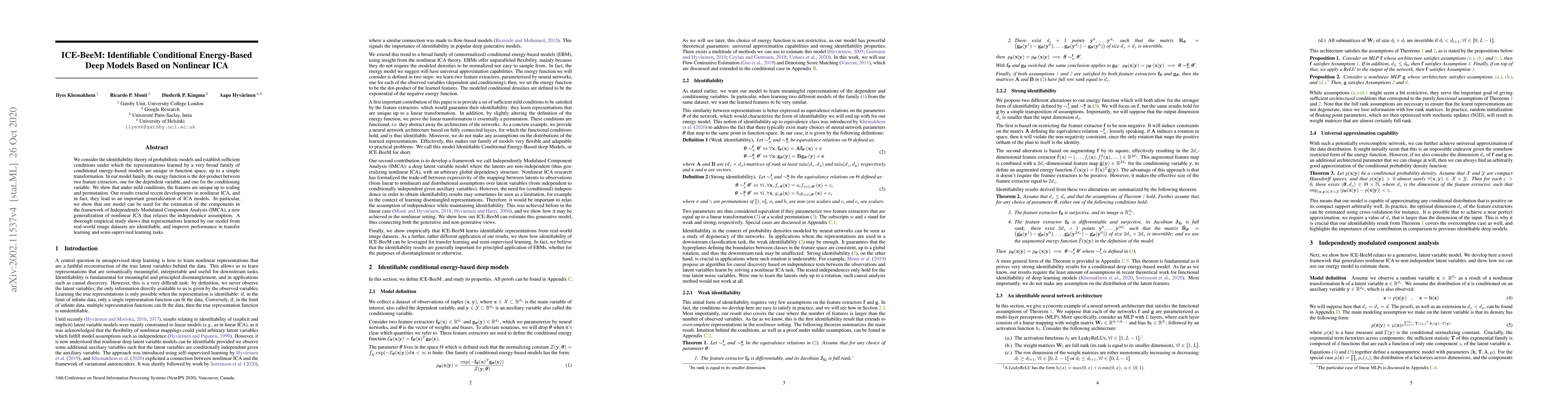 This paper establishes sufficient conditions for the identifiability of a broad family of conditional energy-based models based on nonlinear ICA, showing unique representations under mild conditions. The proposed model, ICE-BeeM, extends recent nonlinear ICA developments and can estimate components in Independently Modulated Component Analysis (IMCA), demonstrating improved performance in transfer and semi-supervised learning tasks.