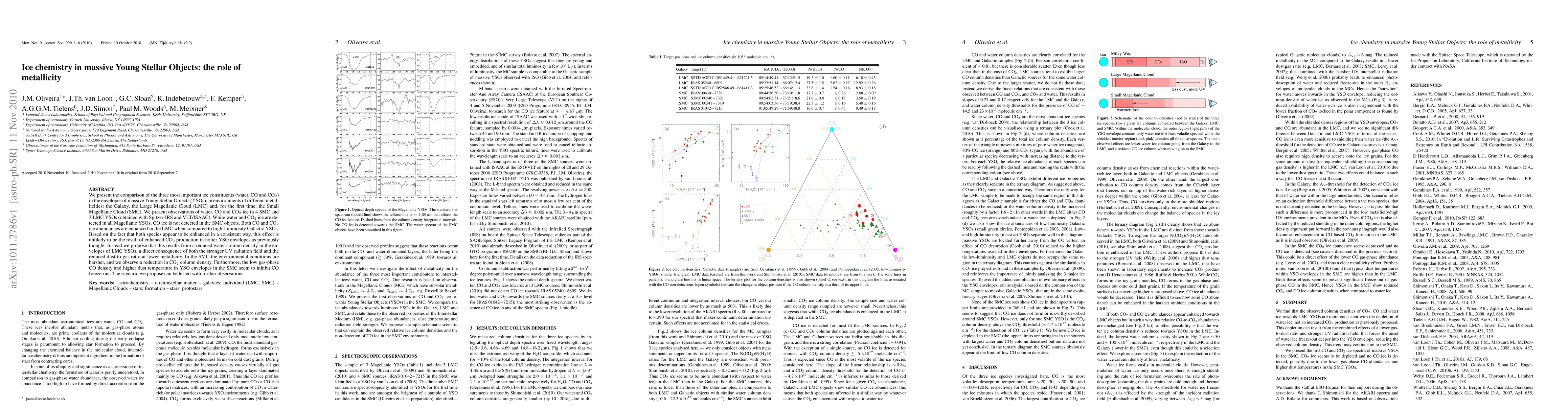 This paper investigates the ice chemistry of water, CO, and CO2 in massive Young Stellar Objects (YSOs) across different metallicities in the Galaxy, LMC, and SMC. Observations show that CO ice is absent in SMC YSOs, while CO and CO2 ice abundances are enhanced in LMC YSOs due to reduced water column density, likely from stronger UV radiation and lower dust-to-gas ratio. In the SMC, harsher conditions reduce CO2 and inhibit CO freeze-out.
