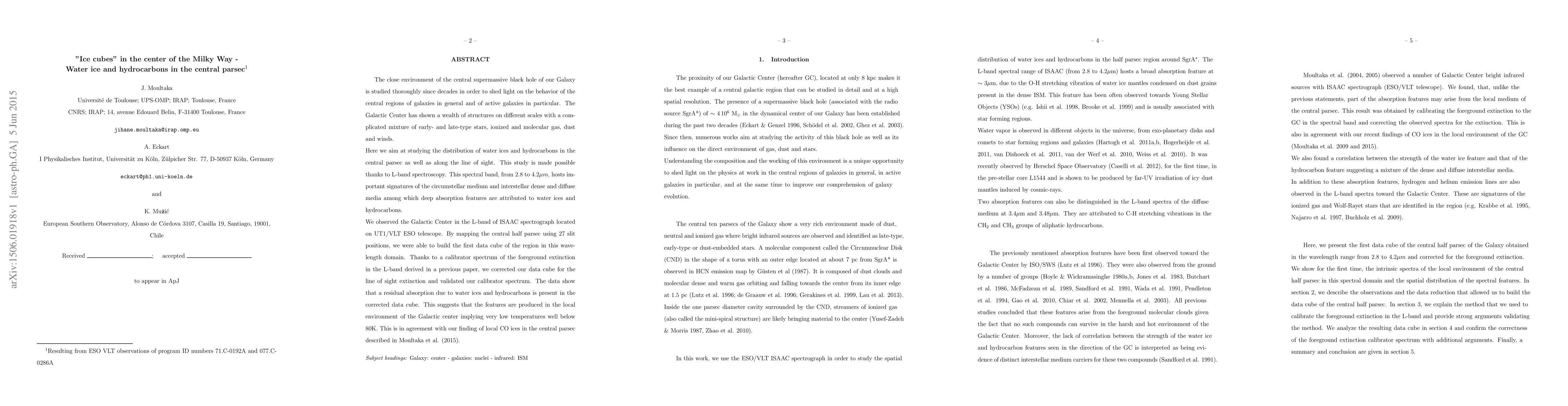The close environment of the central supermassive black hole of our Galaxy is studied thoroughly since decades in order to shed light on the behavior of the central regions of galaxies in general and of active galaxies in particular. The Galactic Center has shown a wealth of structures on different scales with a complicated mixture of early- and late-type stars, ionized and molecular gas, dust and winds. Here we aim at studying the distribution of water ices and hydrocarbons in the central parsec as well as along the line of sight. This study is made possible thanks to L-band spectroscopy. This spectral band, from 2.8 to 4.2$\mu m$, hosts important signatures of the circumstellar medium and interstellar dense and diffuse media among which deep absorption features are attributed to water ices and hydrocarbons. We observed the Galactic Center in the L-band of ISAAC spectrograph located on UT1/VLT ESO telescope. By mapping the central half parsec using 27 slit positions, we were able to build the first data cube of the region in this wavelength domain. Thanks to a calibrator spectrum of the foreground extinction in the L-band derived in a previous paper, we corrected our data cube for the line of sight extinction and validated our calibrator spectrum. The data show that a residual absorption due to water ices and hydrocarbons is present in the corrected data cube. This suggests that the features are produced in the local environment of the Galactic center implying very low temperatures well below 80K. This is in agreement with our finding of local CO ices in the central parsec described in Moultaka et al. (2015).
