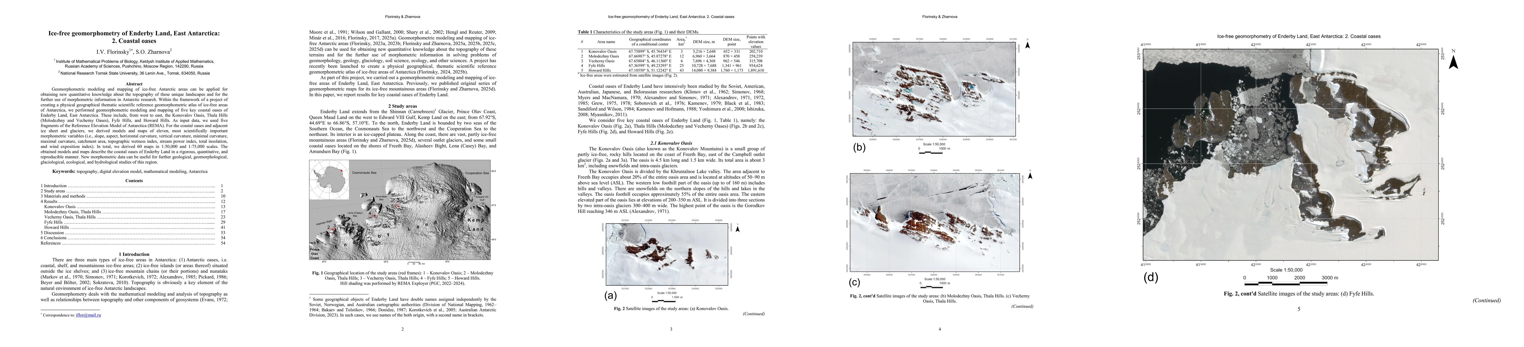 Geomorphometric modeling and mapping of ice-free Antarctic areas can be applied for obtaining new quantitative knowledge about the topography of these unique landscapes and for the further use of morphometric information in Antarctic research. Within the framework of a project of creating a physical geographical thematic scientific reference geomorphometric atlas of ice-free areas of Antarctica, we performed geomorphometric modeling and mapping of five key coastal oases of Enderby Land, East Antarctica. These include, from west to east, the Konovalov Oasis, Thala Hills (Molodezhny and Vecherny Oases), Fyfe Hills, and Howard Hills. As input data, we used five fragments of the Reference Elevation Model of Antarctica (REMA). For the coastal oases and adjacent ice sheet and glaciers, we derived models and maps of eleven, most scientifically important morphometric variables (i.e., slope, aspect, horizontal curvature, vertical curvature, minimal curvature, maximal curvature, catchment area, topographic wetness index, stream power index, total insolation, and wind exposition index). In total, we derived 60 maps in 1:50,000 and 1:75,000 scales. The obtained models and maps describe the coastal oases of Enderby Land in a rigorous, quantitative, and reproducible manner. New morphometric data can be useful for further geological, geomorphological, glaciological, ecological, and hydrological studies of this region.