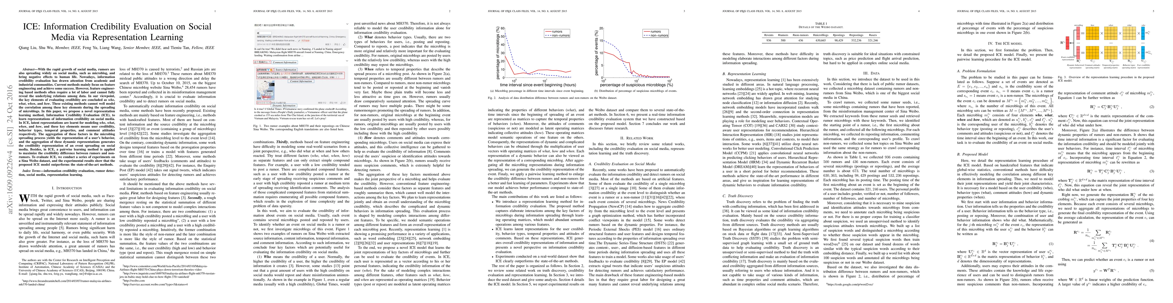 The paper proposes a novel representation learning method, Information Credibility Evaluation (ICE), to assess information credibility on social media by modeling user behaviors through latent representations of "who", "what", "when", and "how". ICE outperforms existing methods by effectively capturing the correlation among these elements and distinguishing rumors from non-rumors, as demonstrated through experiments on Sina Weibo data.