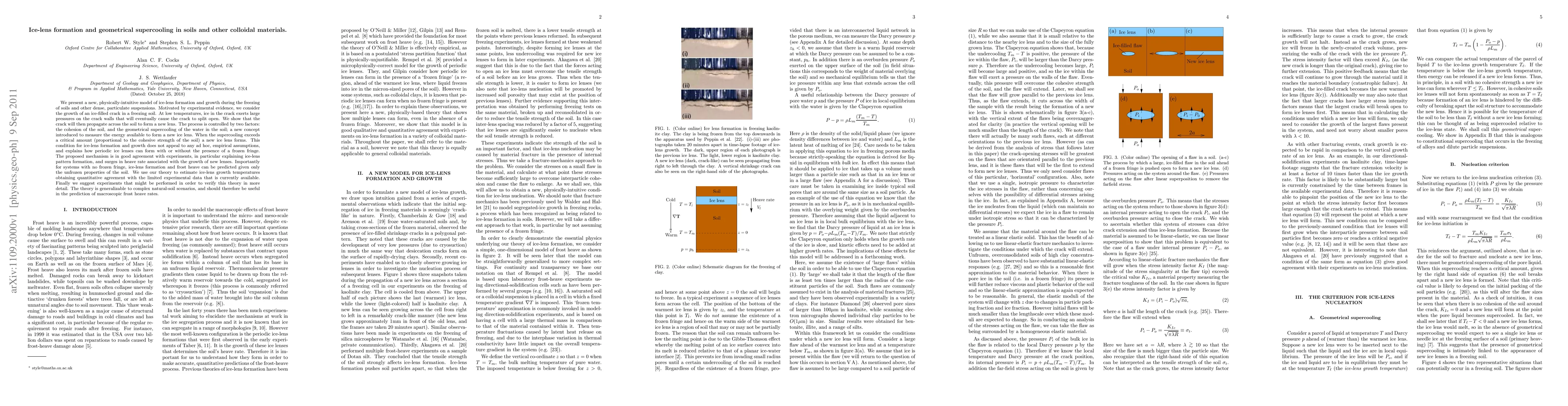 This paper proposes a new model for ice-lens formation in freezing soils, driven by the interplay of soil cohesion and geometrical supercooling. The model explains the periodic formation of ice lenses and frost heave without relying on empirical assumptions, and aligns well with experimental observations.